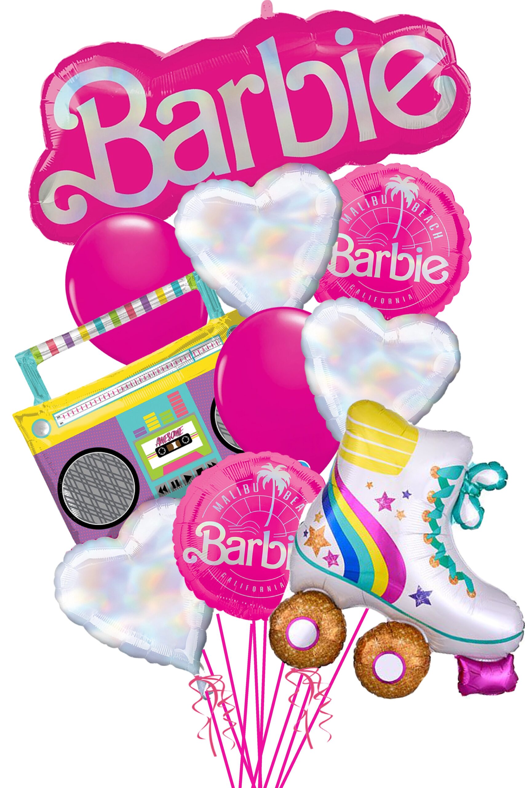 A mix of bright Barbie mylar/latex balloons on a balloon weight make for a fun surprise!