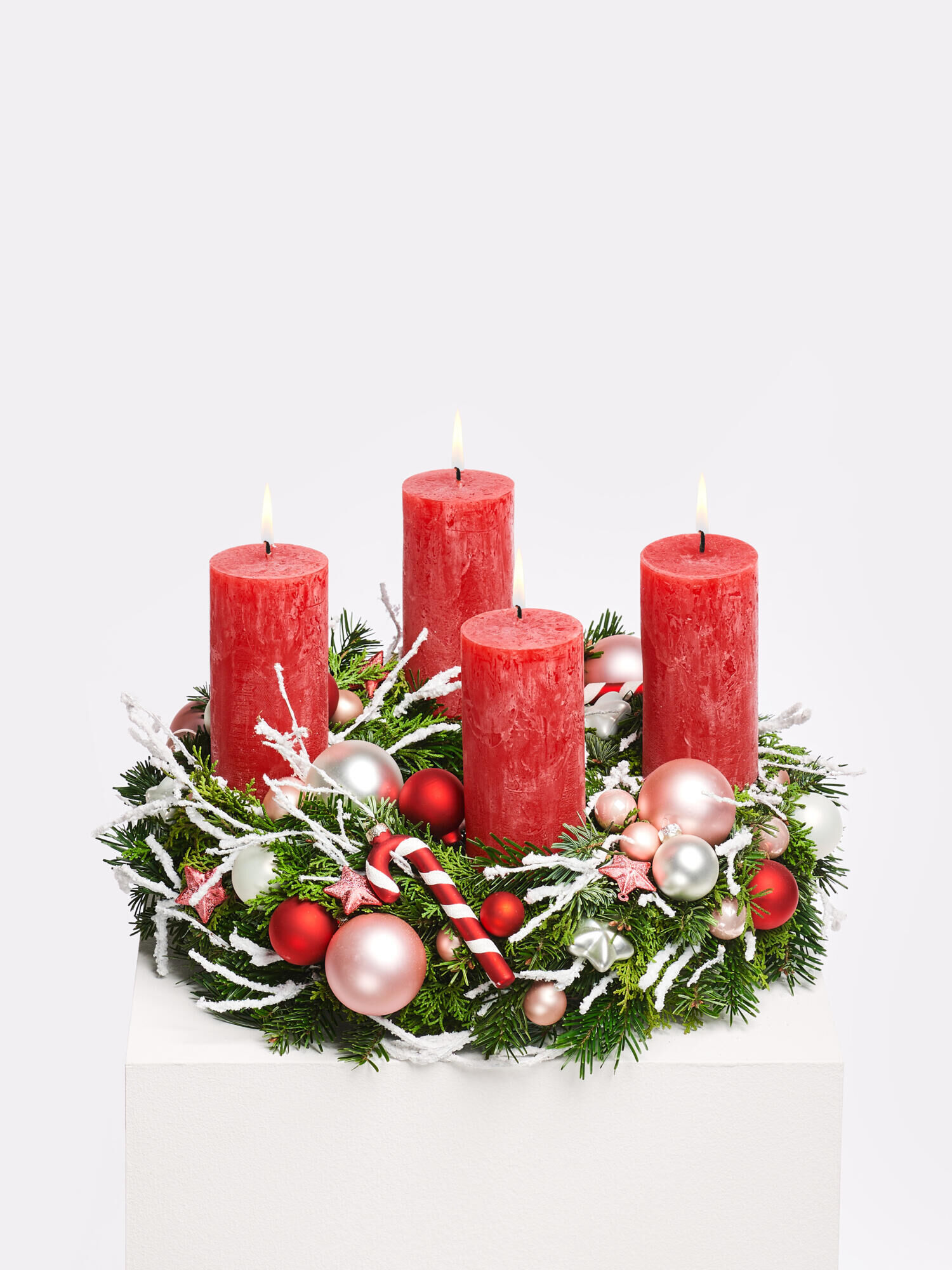 Dieser Adventskranz aus einem Mix aus Nobilis-Tanne und Koniferen sieht einfach zauberhaft aus! Die vier roten Stumpenkerzen schaffen eine weihnachtliche, festliche Atmosphäre, während die roten, silbernen, weißen und rosafarbenen Glaskkugeln und -sterne zusammen mit den weißen Schneesternen sowie Zuckerstangen in Rot-Weiß für einen schönen winterlichen Glanz sorgen. Mit einem Außendurchmesser von ca. 40 cm eignet er sich hervorragend als Tischdekoration oder für einen zentralen Platz im Raum. Ein wirklich stilvoller Kranz, der die Vorfreude auf Weihnachten wunderbar unterstreicht!