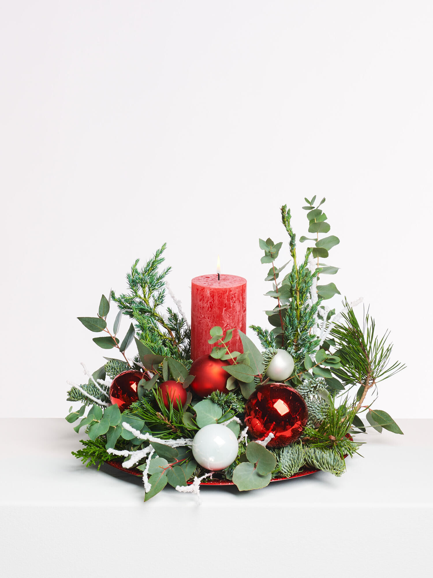 In der Mitte erstrahlt eine rote Stumpenkerze, die ein warmes, einladendes Licht verbreitet, umgeben von eleganten Glaskugeln in Rot, Weiß und Silber. Mit einem Außendurchmesser von ca. 40 cm ist dieses Arrangement perfekt für unvergessliche Weihnachtsmomente!