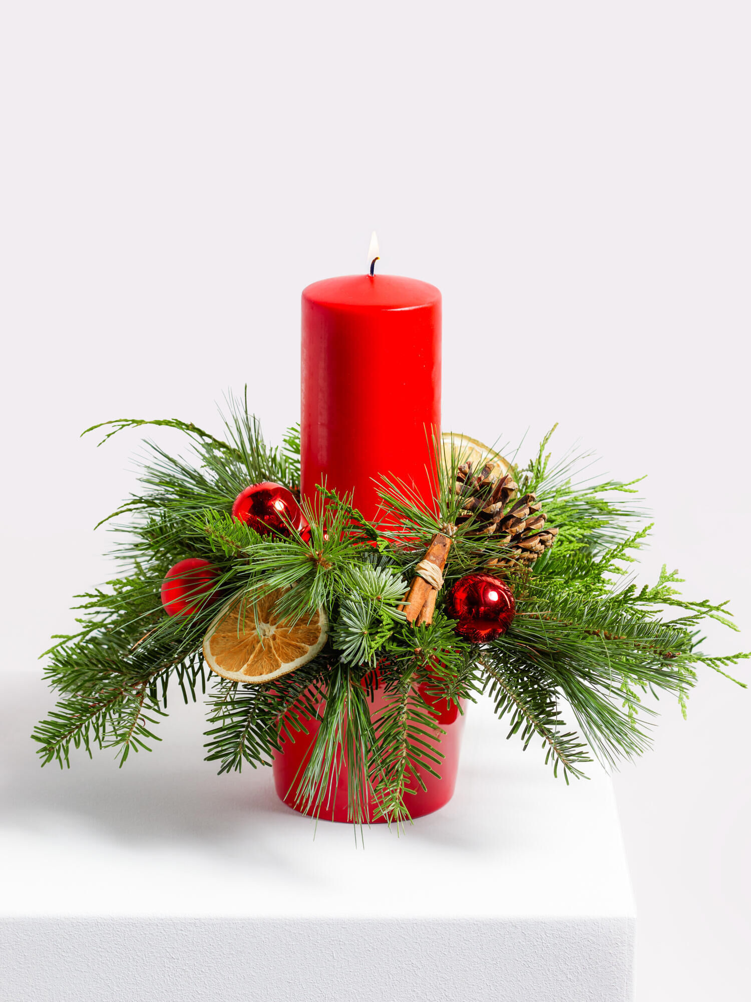 Adventsgesteck in rotem Übertopf (12 cm) mit einer roten Stumpenkerze, Zapfen, Zimtstangen, Orangenscheiben, roten Weihnachtskugeln aus Glas sowie mit Koniferen-, Nordmanntannen- und Kiefernzweigen.