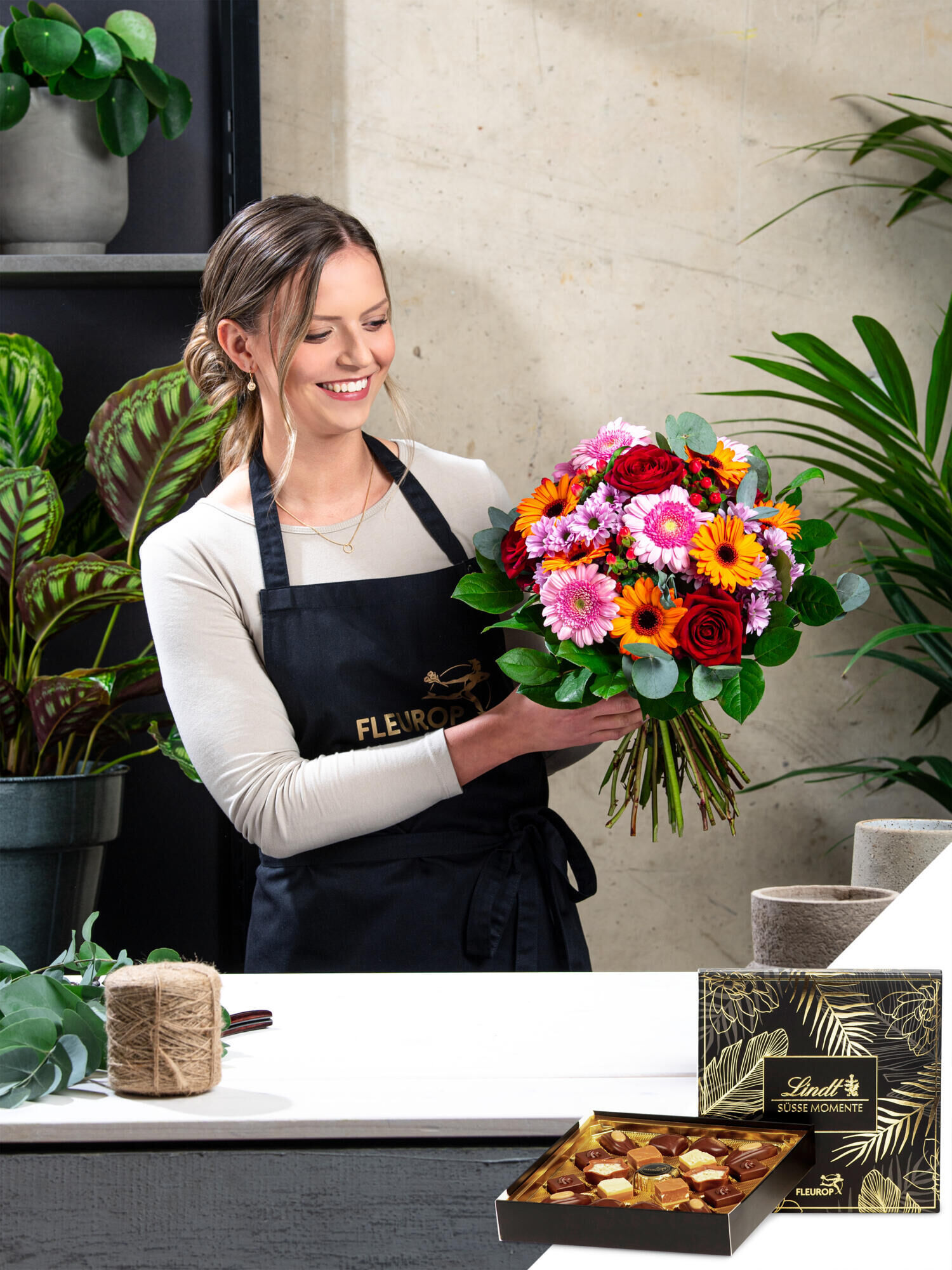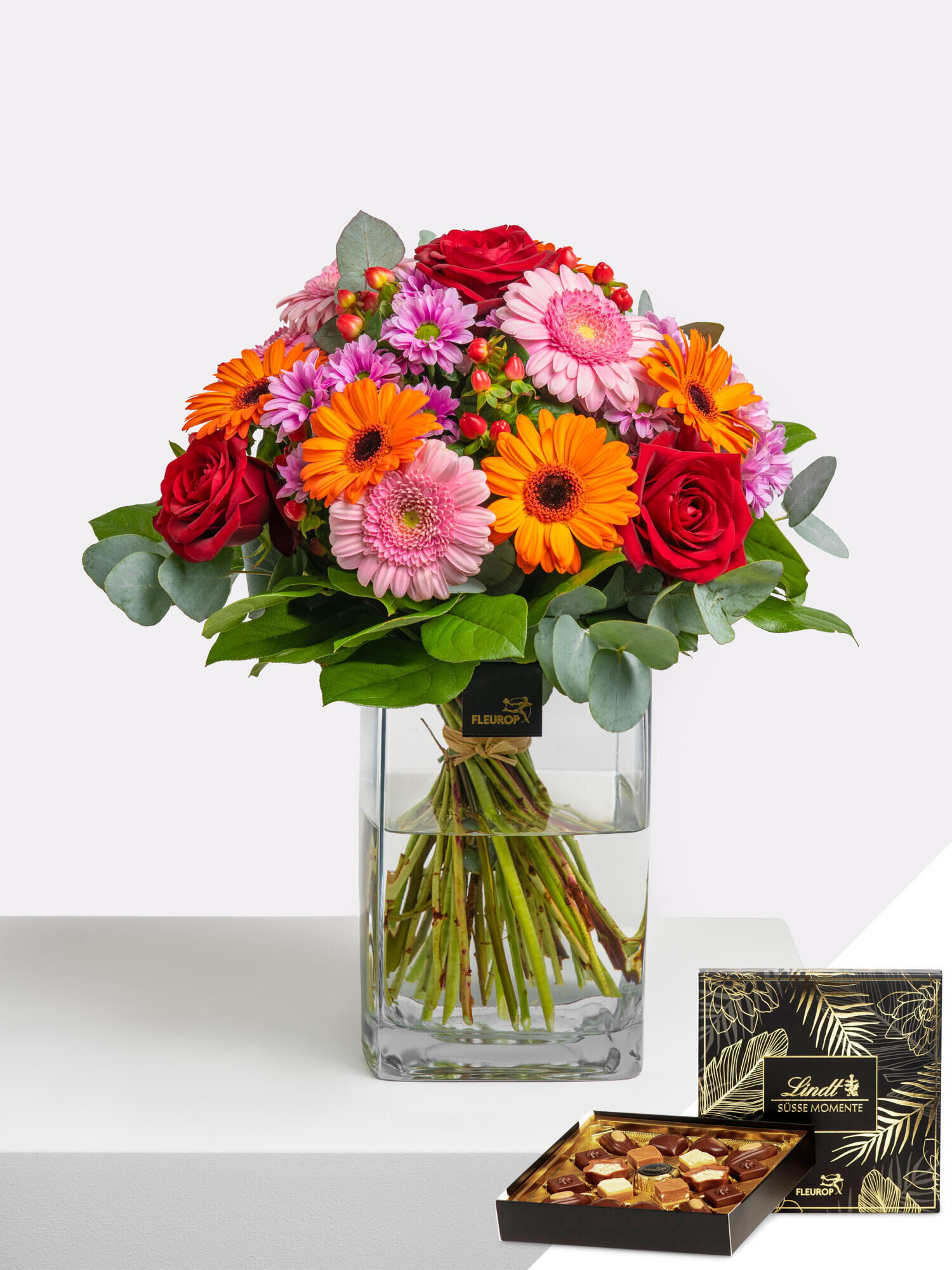 Abgerundet wird der Blumengruß durch eine edle Schachtel Lindt Mini-Pralinés (19 Stück, 97 g), im exklusiven Fleurop-Design. Die feine Auswahl hochwertiger Schokoladenkreationen sorgt für zartschmelzende Genussmomente und macht dieses Set zu einem Geschenk, das alle Sinne berührt. Die feine Auswahl umfasst:
