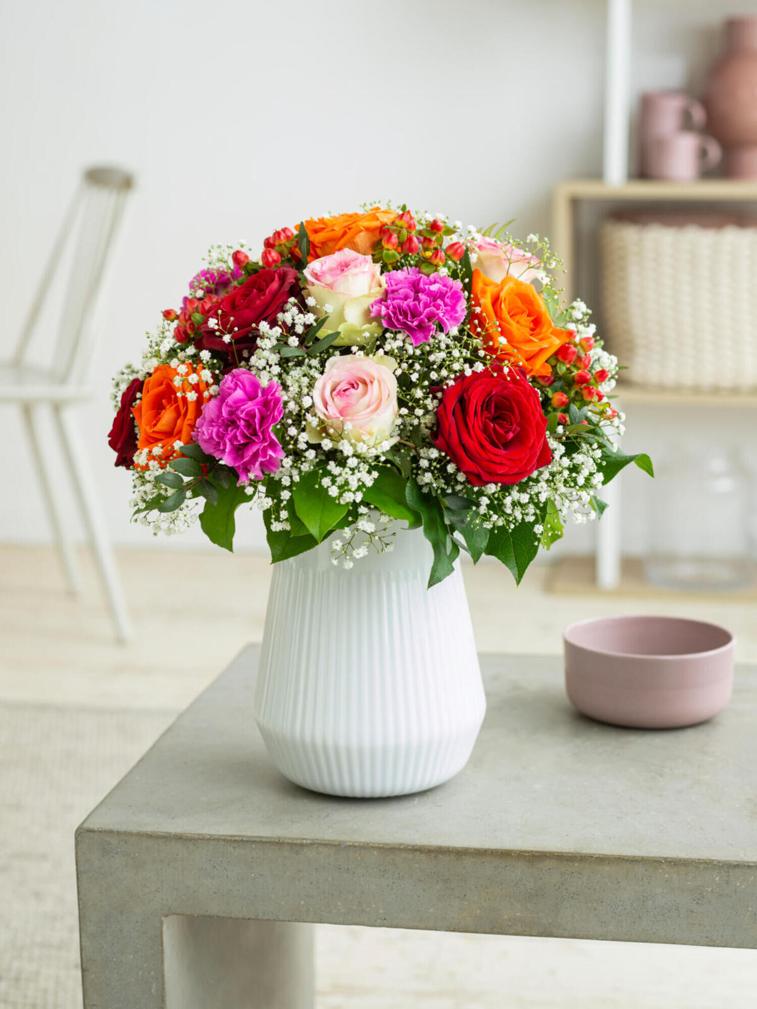 Liebevoller kann man nicht gratulieren! Wünschen Sie “Alles Liebe zum Geburtstag” mit diesem farbenfrohen Blumengruß. Rund gebundener Strauß in Rot-Rosa-Orange-Rosé mit Rosen, Nelken, Hypericum und Schleierkraut. Als Beiwerk werden Pistazie und Salal verwendet.