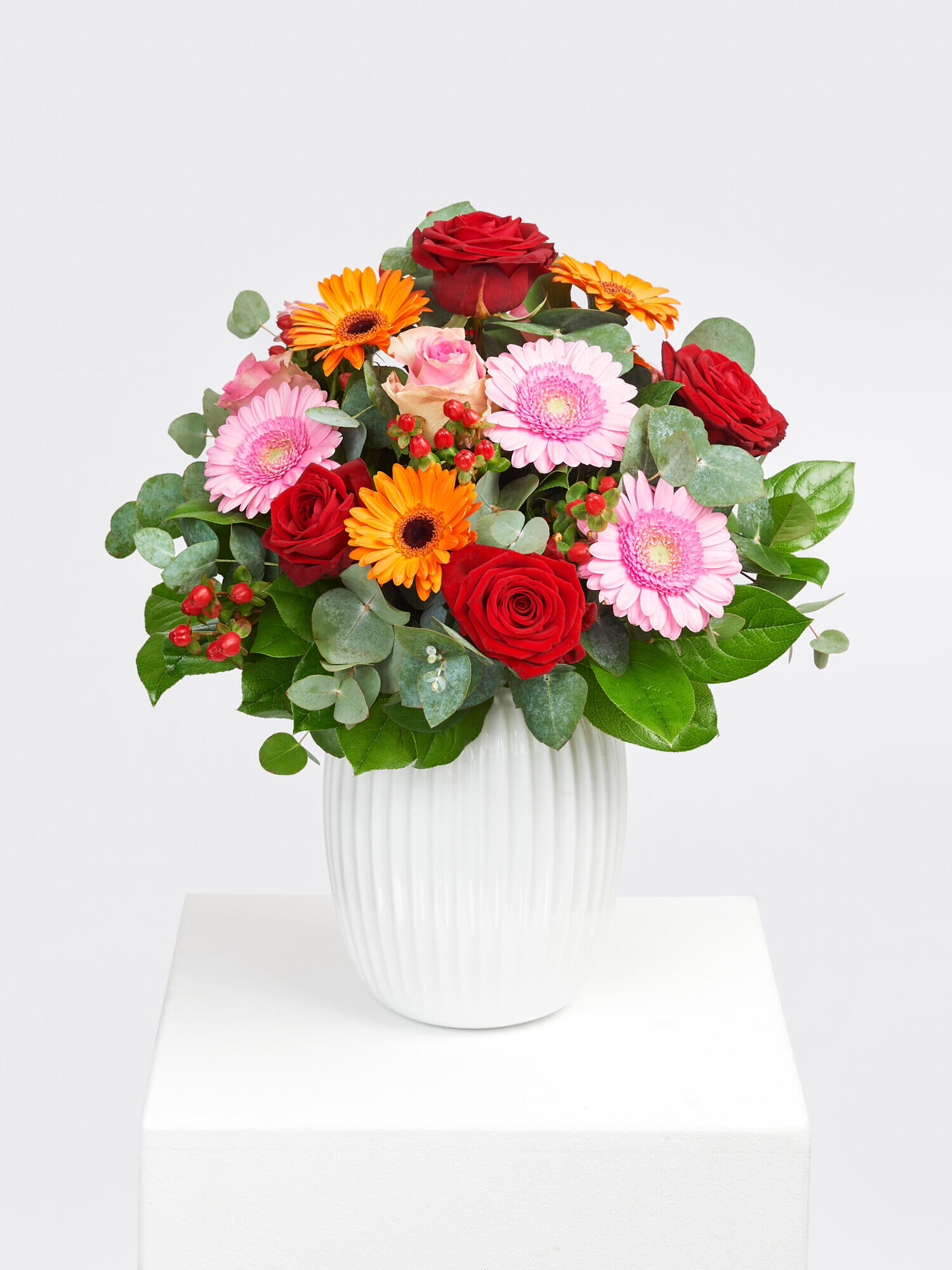 Verschicken Sie “Liebste Grüße” mit diesem wunderschönen Blumenstrauß. Rund gebundener Strauß in Rot-Orange-Rosa mit Rosen, Germini und Hypericum. Als Beiwerk werden Eukalyptus und Salal verwendet.