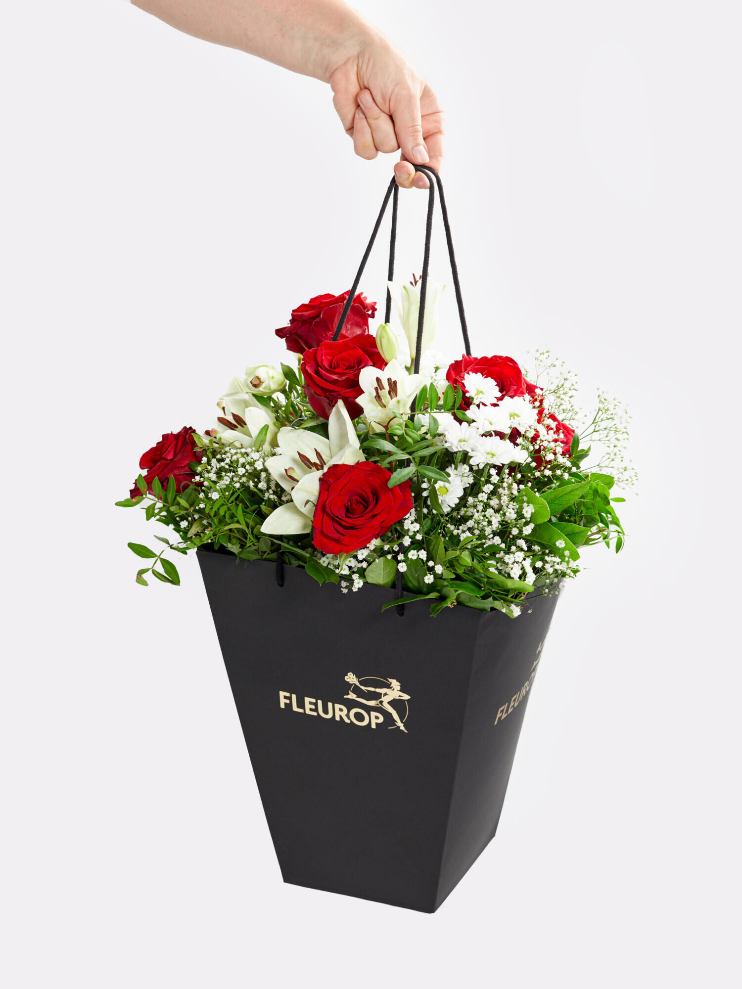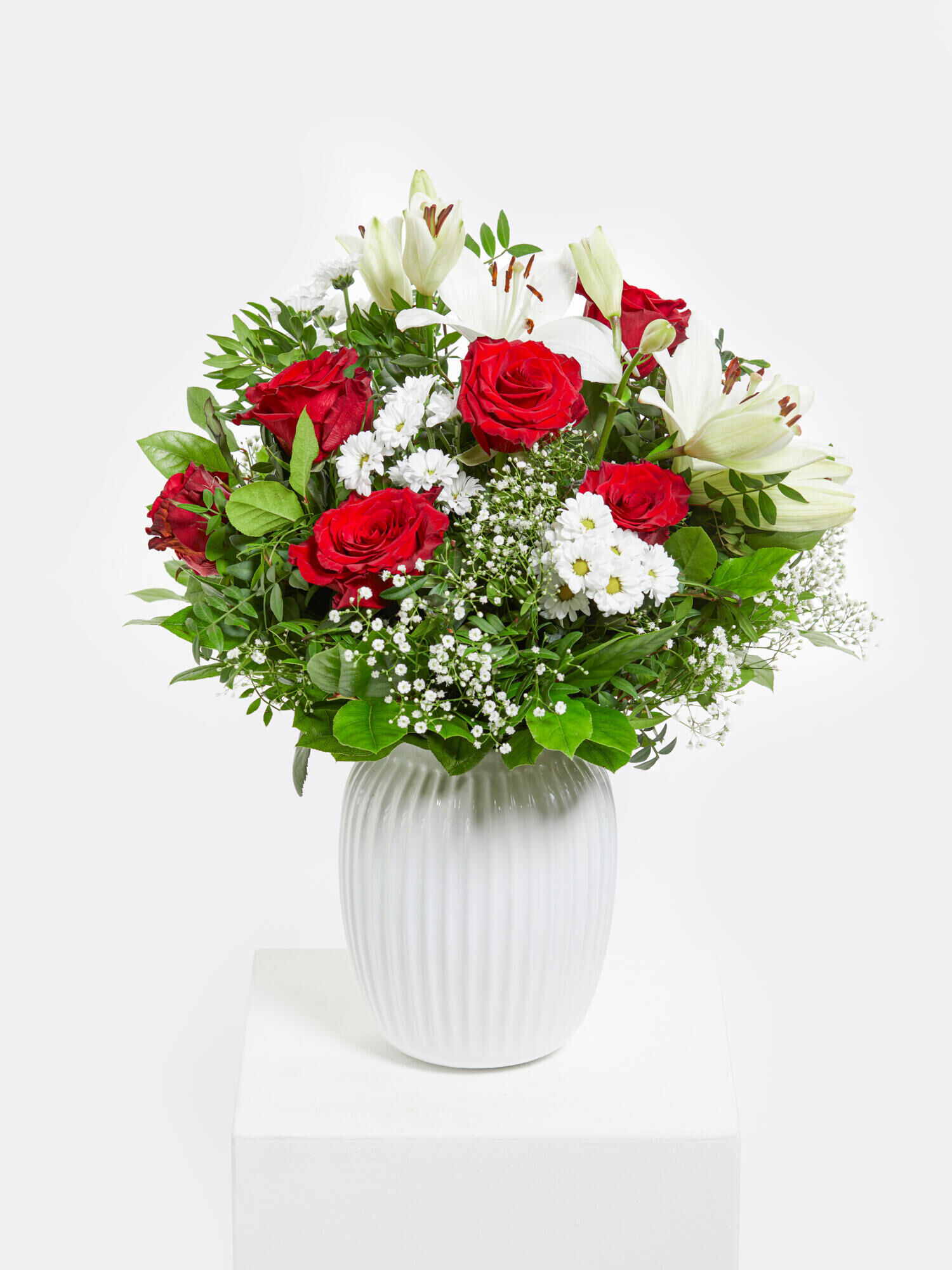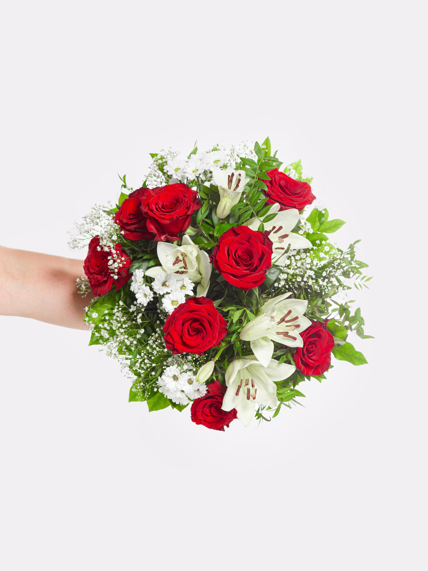 Aufgelockerter Strauß, der zu jedem Anlass passt: Ob zum Valentinstag, Jubiläum oder einfach so – dieser zeitlose Klassiker ist immer eine gute Wahl. Die Kombination aus roten Rosen sowie intensiv duftenden Lilien, Santini und Schleierkraut in Weiß ist ein Garant für Eleganz und Romantik. Ergänzt wird das Arrangement durch das frische Grün von Salal und Pistazie.