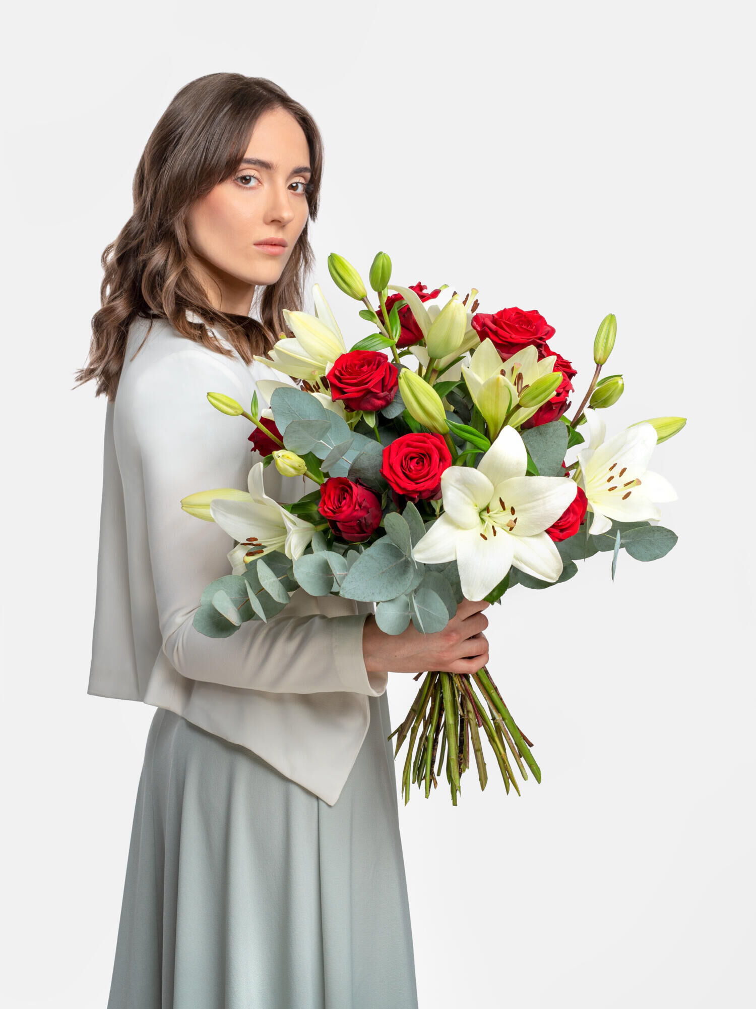 Intensiv duftender Strauß mit Lilien, Rosen und Eukalyptus