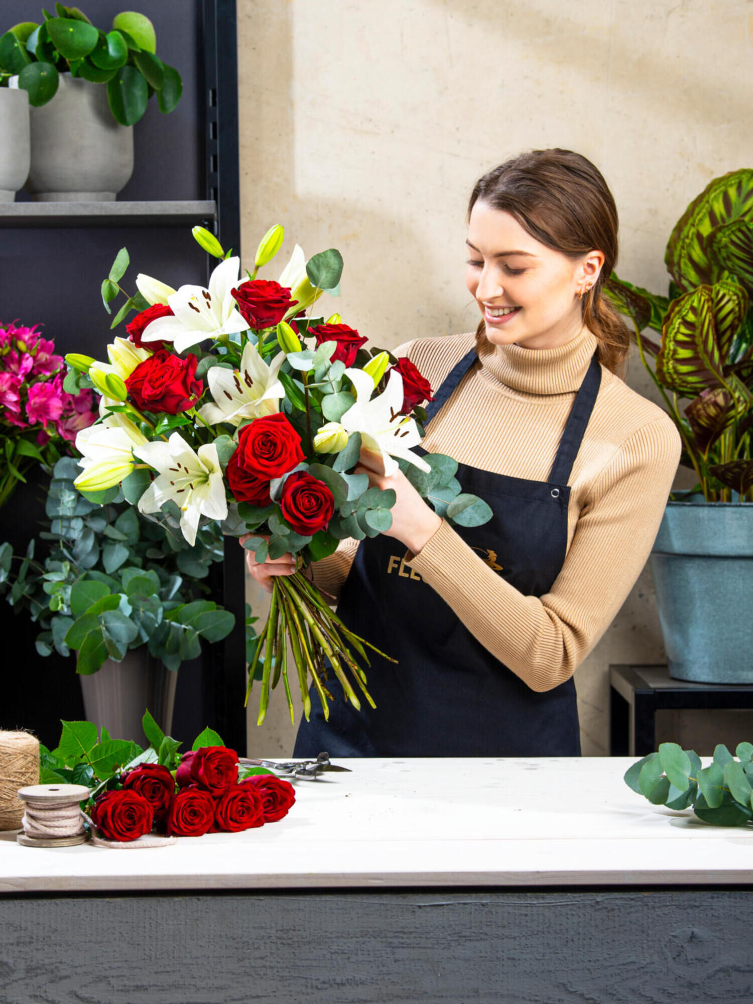 “Ti Amo” – eine Liebeserklärung in Blumen. Dieser Strauß vereint die klassische Schönheit roter großblütiger Rosen mit der Eleganz weißer Lilien. Die prachtvollen Blüten der Lilien stehen für Reinheit und Anmut, während die roten Rosen Leidenschaft und Liebe symbolisieren. Ergänzt wird das Arrangement durch das frische Grün des Eukalyptus. Ein perfektes Geschenk für den Valentinstag, einen Hochzeitstag oder einfach so, um jemandem zu zeigen, wie sehr man ihn liebt.