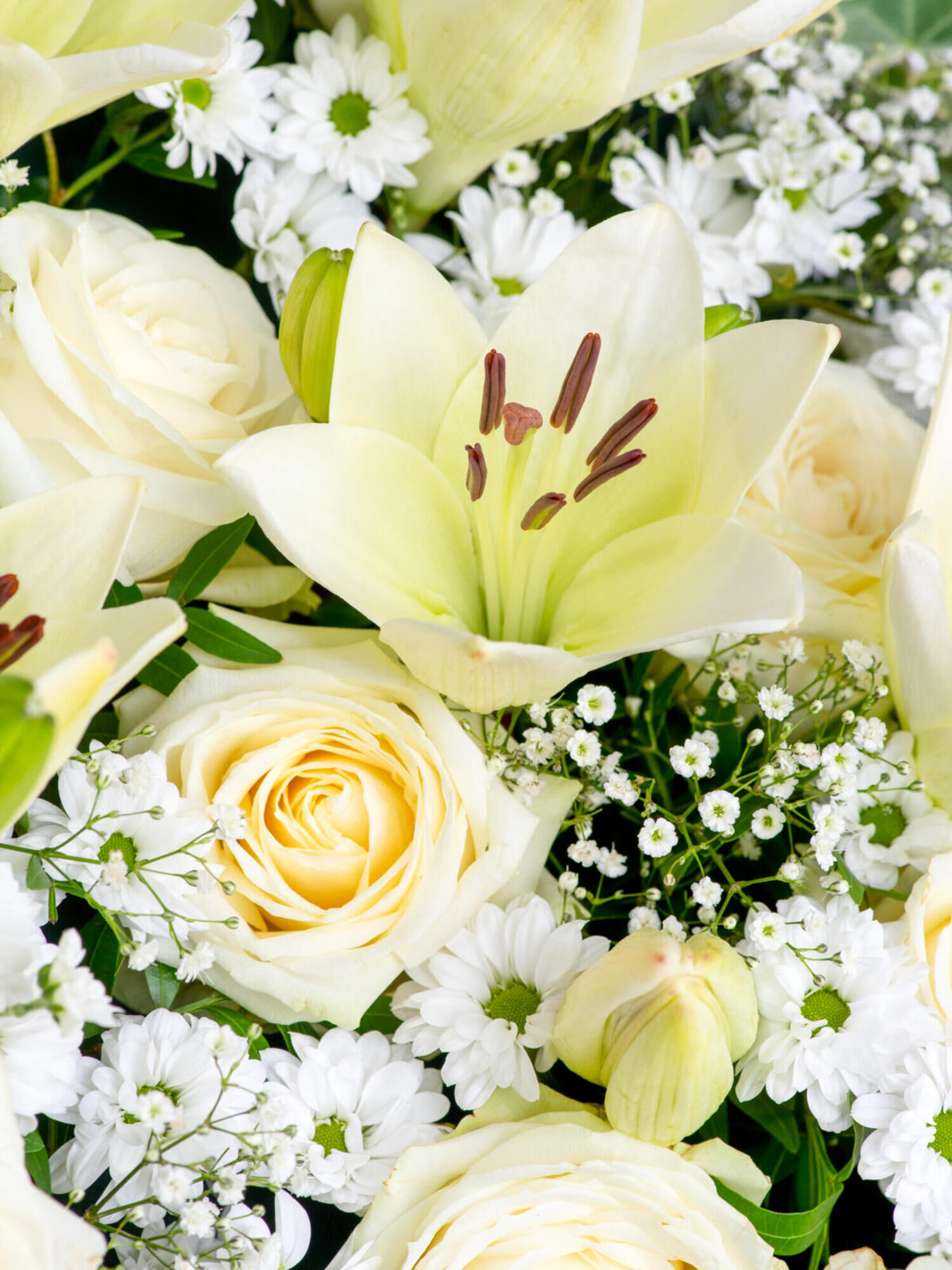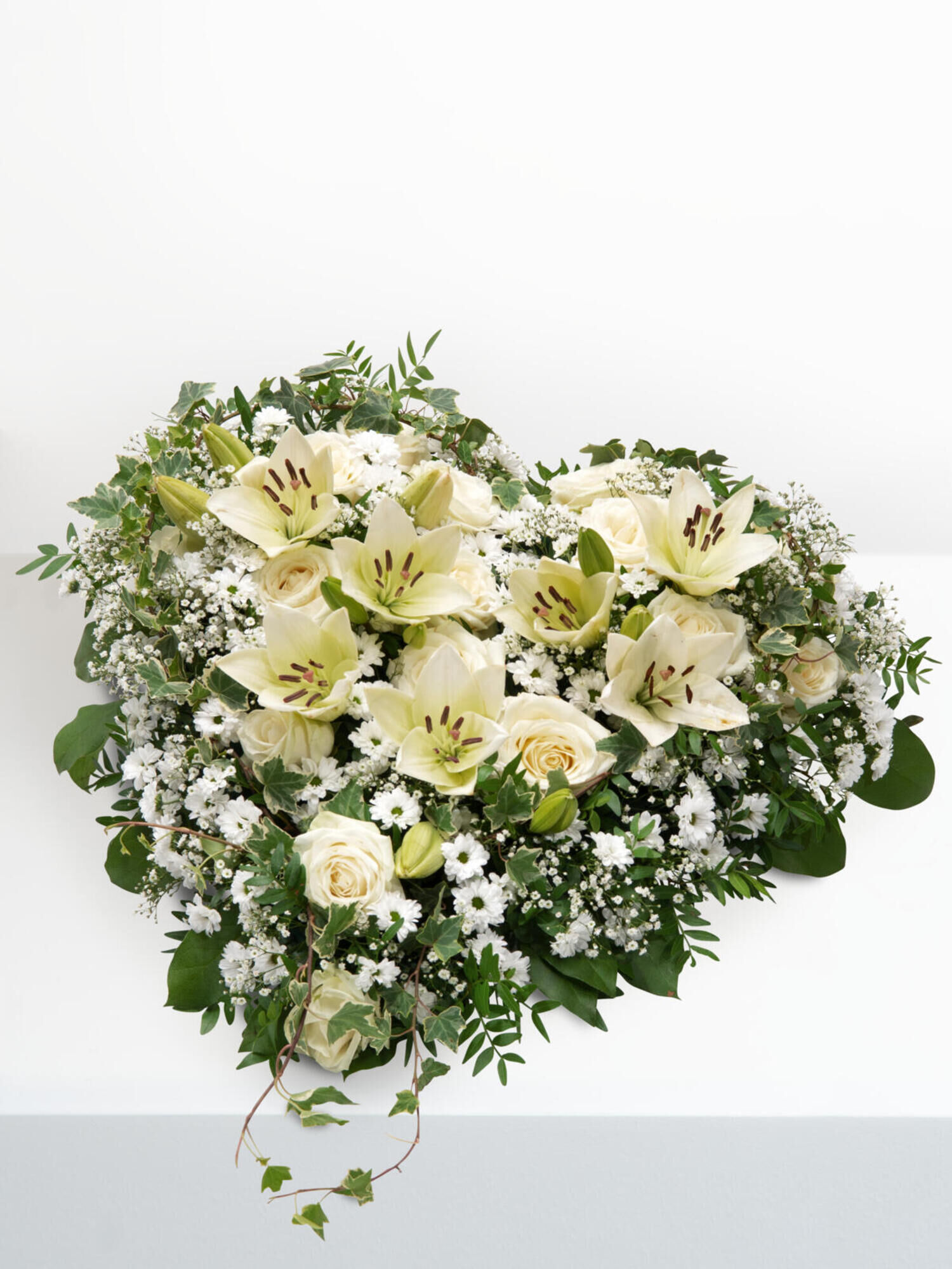Trauergesteck in Herzform in Weiß-Grün mit Rosen, Santini, Schleierkraut und Lilien. Als Beiwerk werden Pistazie, Salal, Asparagus und Efeu verwendet.
