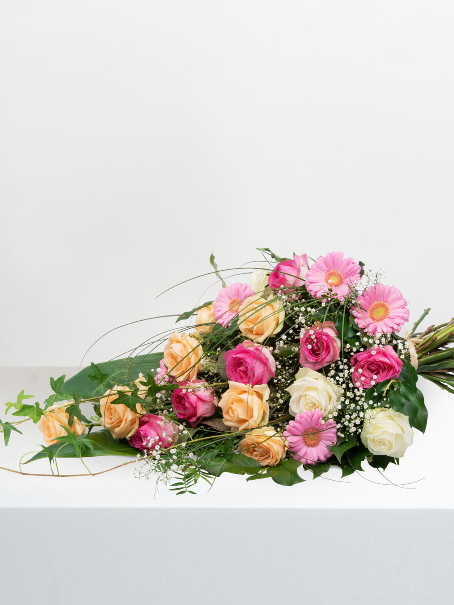 Lang gebundener Trauerstrauß in Rosa-Apricot mit weißen Akzenten mit Rosen, Germini und Schleierkraut. Als Beiwerk werden Pistazie, Salal, Bärgras, Efeu, Efeuranken und Cordeline verwendet.