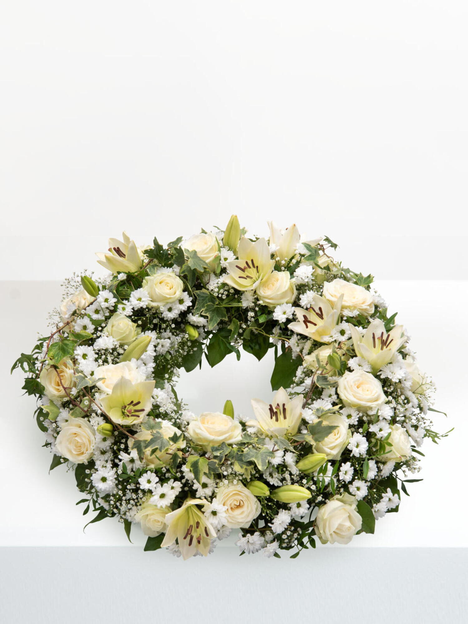 Trauerkranz in Weiß-Grün mit Rosen, Santini, Schleierkraut und Lilien. Als Beiwerk werden Pistazie, Salal und Efeu verwendet.