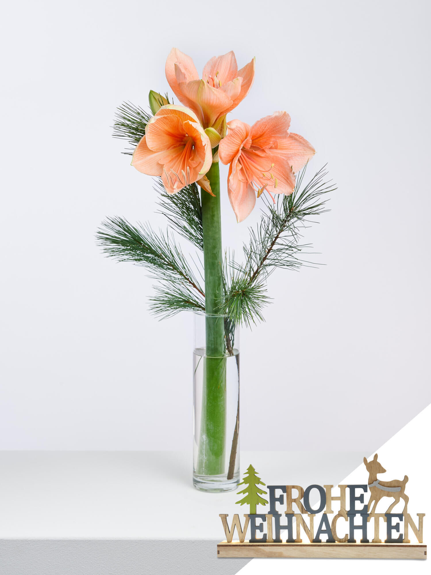 Genießen Sie die besinnliche Zeit vor Weihnachten mit dieser wunderschönen lachsfarbenen Amaryllis kombiniert mit Kieferzweigen. Die Lieferung erfolgt zusammen mit dem LED-beleuchteten Holzaufsteller “Frohe Weihnachten” (L: 45 cm, B: 5 cm, H: 22 cm) im praktischen Fleurop-Karton.