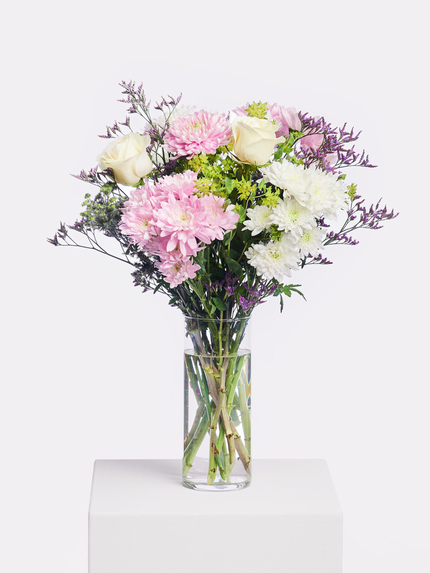 Ausgewählte Schnittblumen in Rosa-Weiß-Violett mit Chrysanthemen, Rosen, Levkojen und Bupleurum, die Sie in der eigenen Vase nach Belieben selbst arrangieren können. Stilecht verpackt und geliefert im Fleurop-Karton.