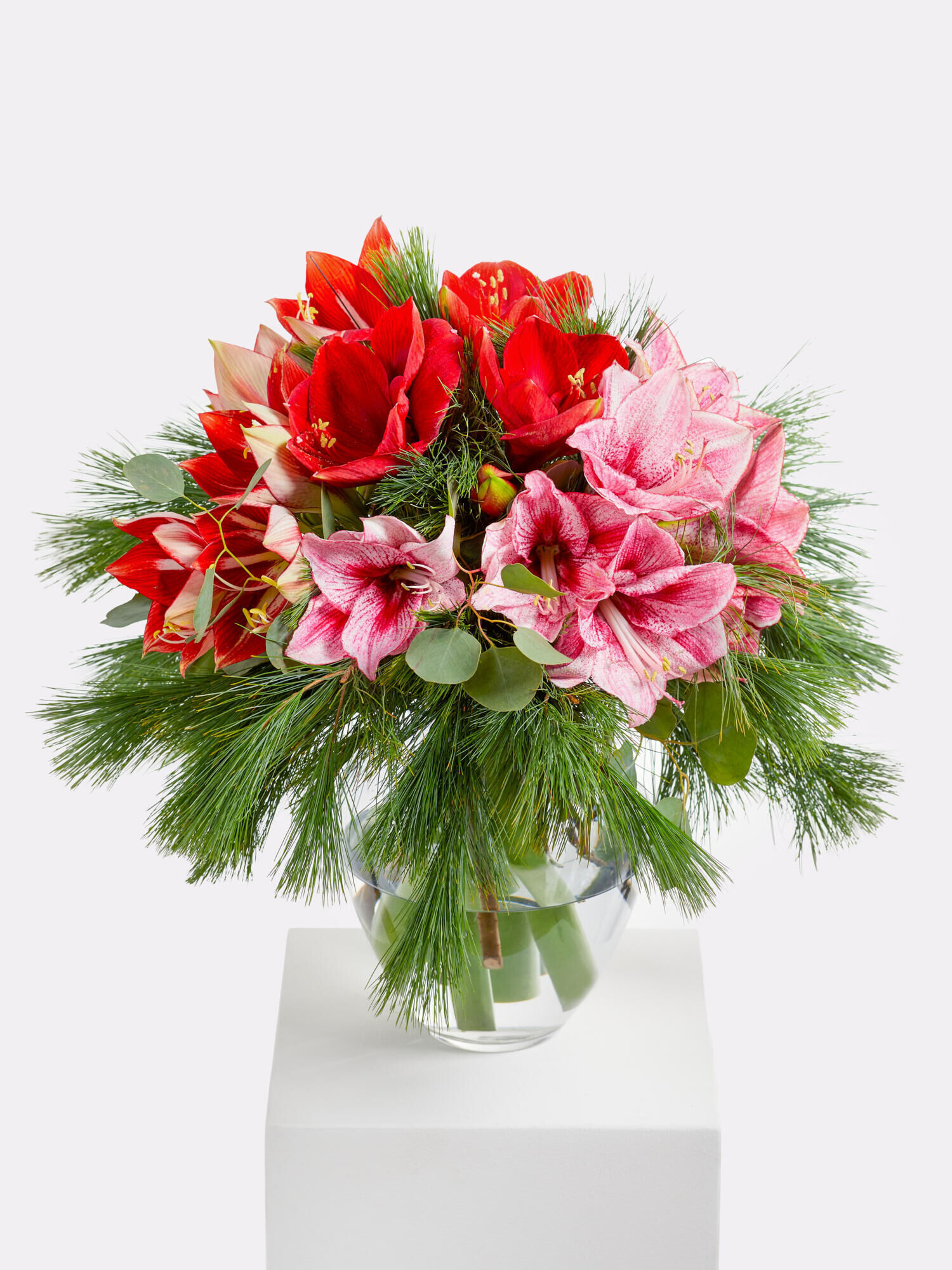 Rund gebundener Strauß mit verschiedenfarbigen Amaryllis in Rot, Pink und Weiß. Als Beiwerk werden Kiefer und Eukalyptus verwendet. Bei geschlossenen Amaryllis kann das vollständige Aufblühen bis zu 2-4 Tagen dauern.