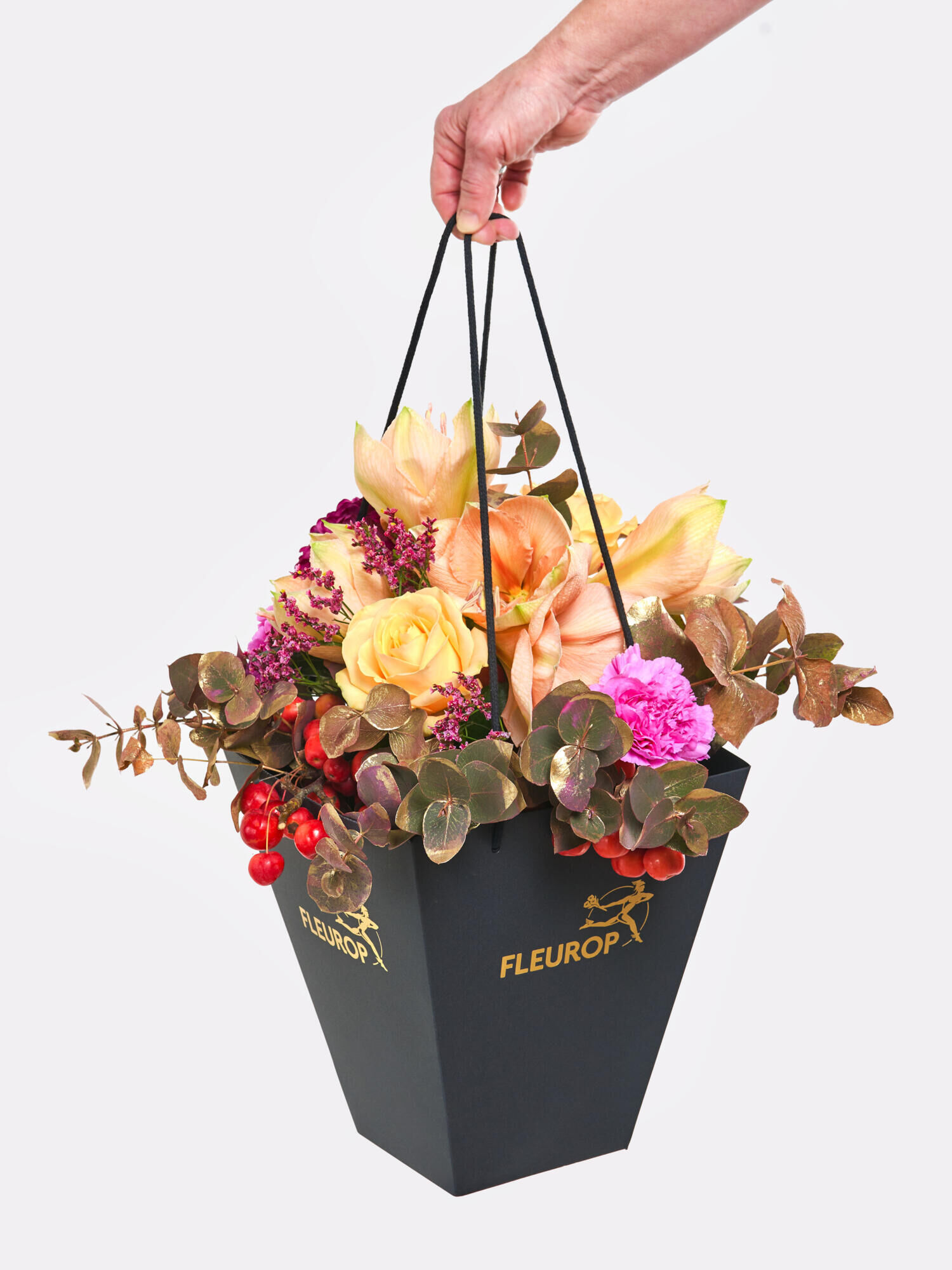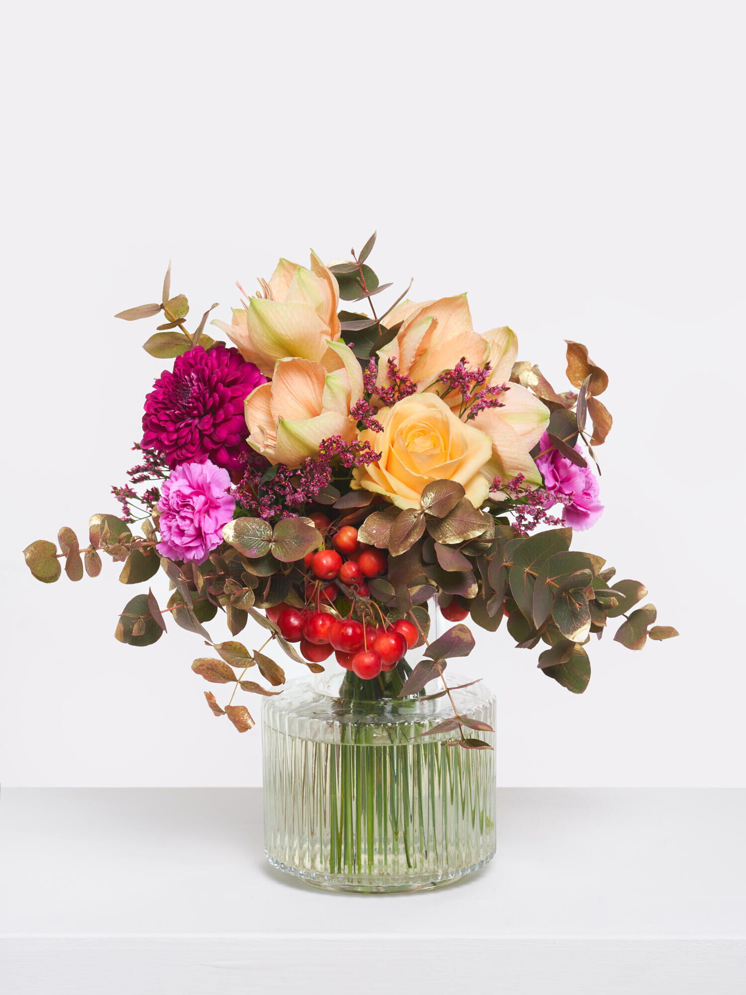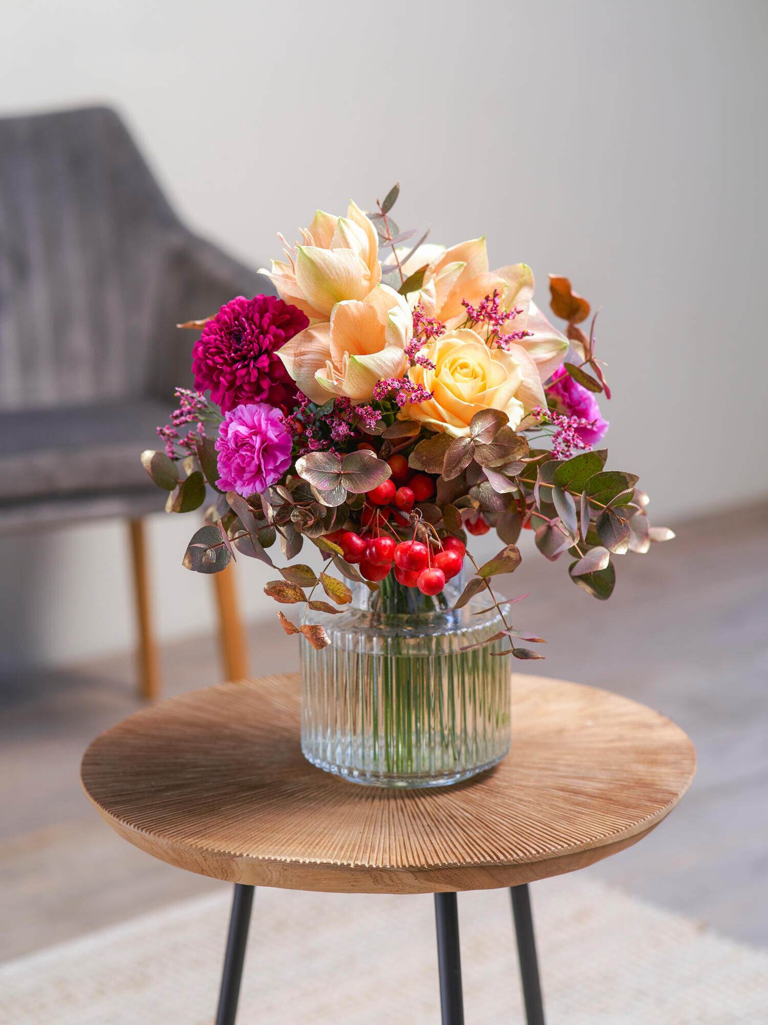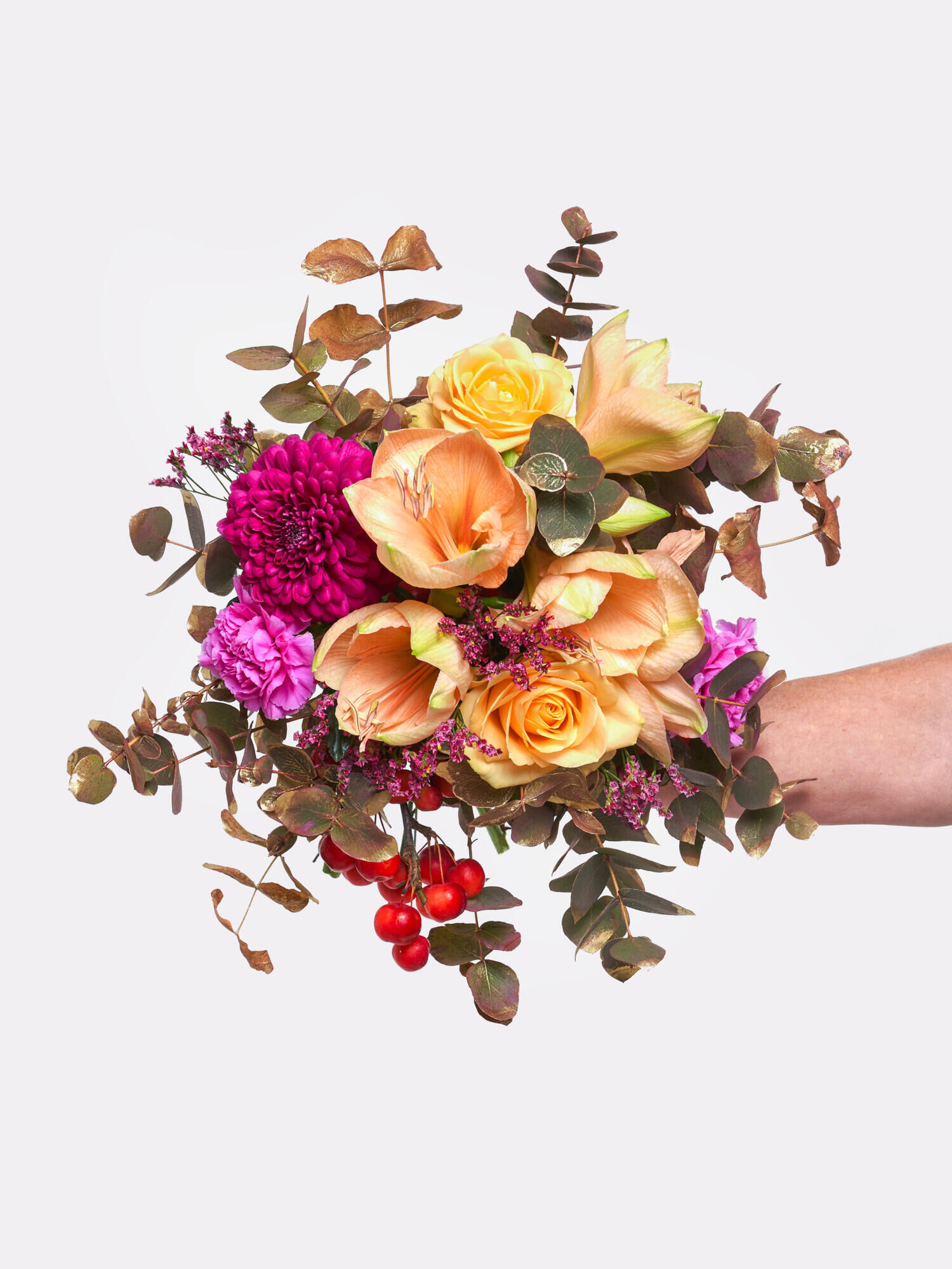 Rund gebundener Strauß in Apricot-Violett-Rot mit Amaryllis, Chrysanthemen, Rosen, Zierapfel, Nelken und Limonium. Als Beiwerk wird Eukalyptus verarbeitet. Bei geschlossenen Amaryllis kann das vollständige Aufblühen bis zu 2-4 Tagen dauern.
