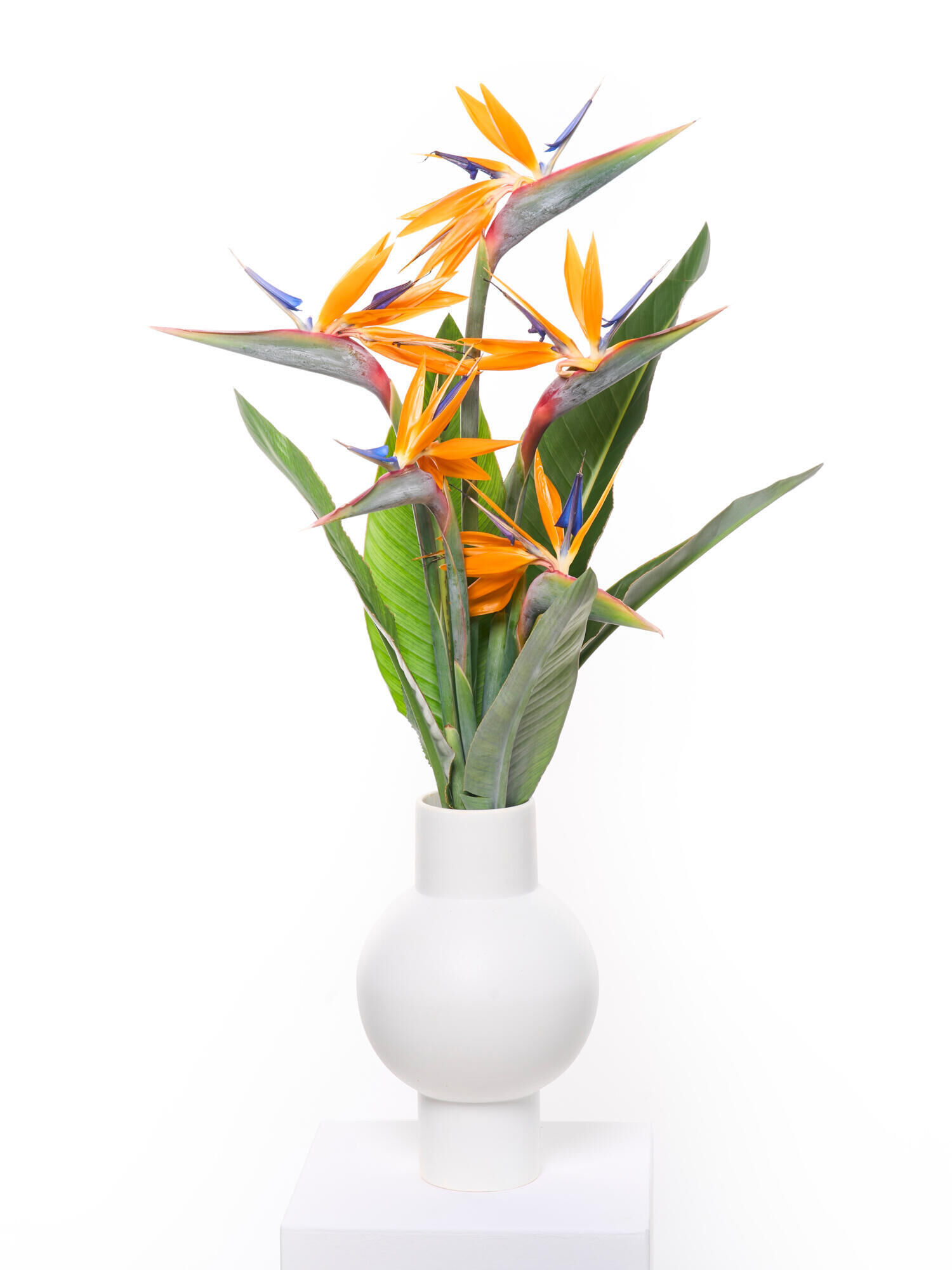 Gestaffelt gebundener Strauß bestehend aus Strelitzien und Strelitzienblättern.