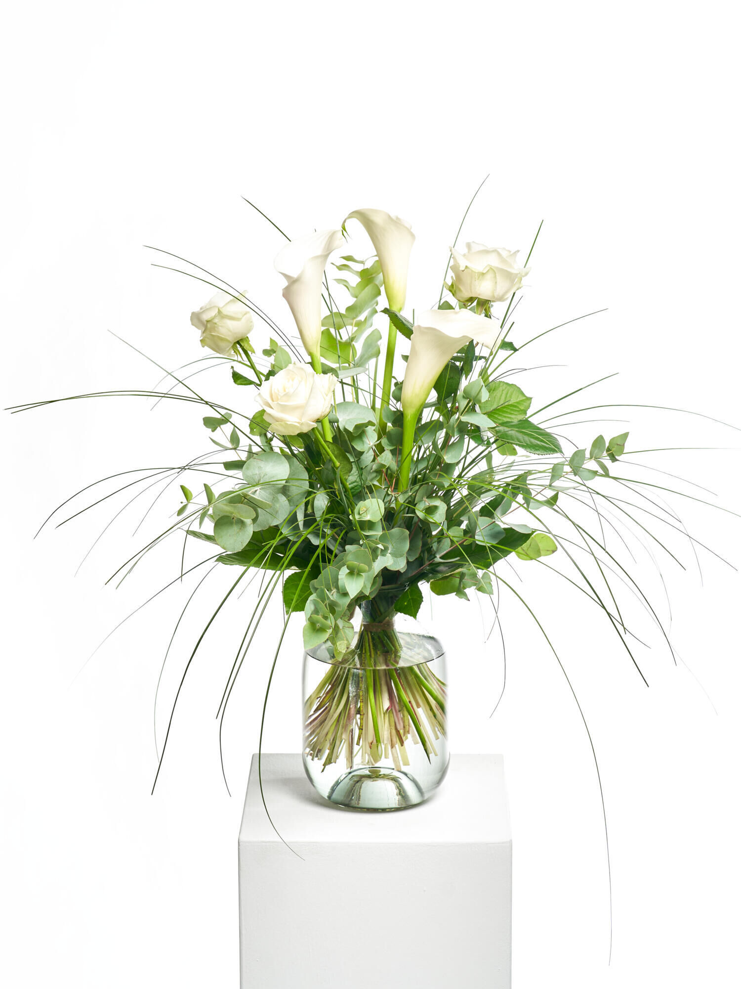 Offen gebundener Strauß in Weiß mit Calla und Rosen. Als Beiwerk werden Eukalyptus, Aralie und Bärgras verwendet.