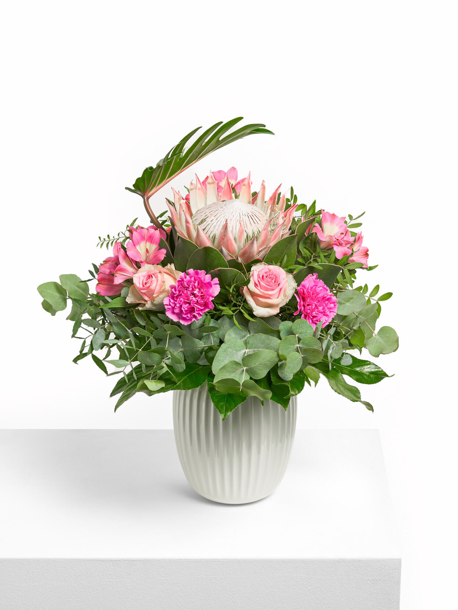 Rund gebundener Strauß in Rosa-Pink mit King-Protea, Rosen, Nelken und Inkalilien (Alstromerien). Als Beiwerk werden Eukalyptus, Pistazie, Aralie und Philodendron ‘Xanadu’ verwendet.