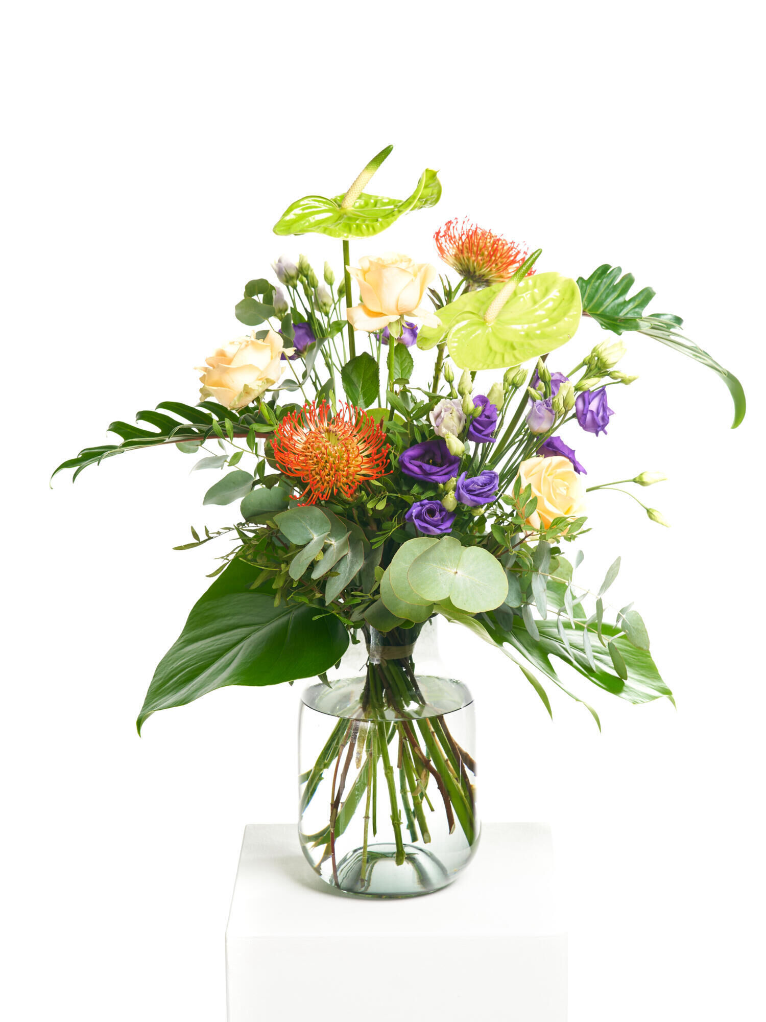Gestaffelt gebundener Strauß in Apricot-Orange-Violett-Grün mit Rosen, Anthurien, Nadelkissen (Nutans) und Eustoma. Als Beiwerk werden Eukalyptus, Pistazie, Aralie, Phildendron ‘Xanadu’ und Monsterablätter verwendet.