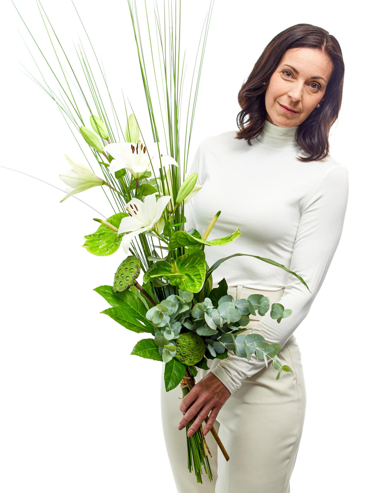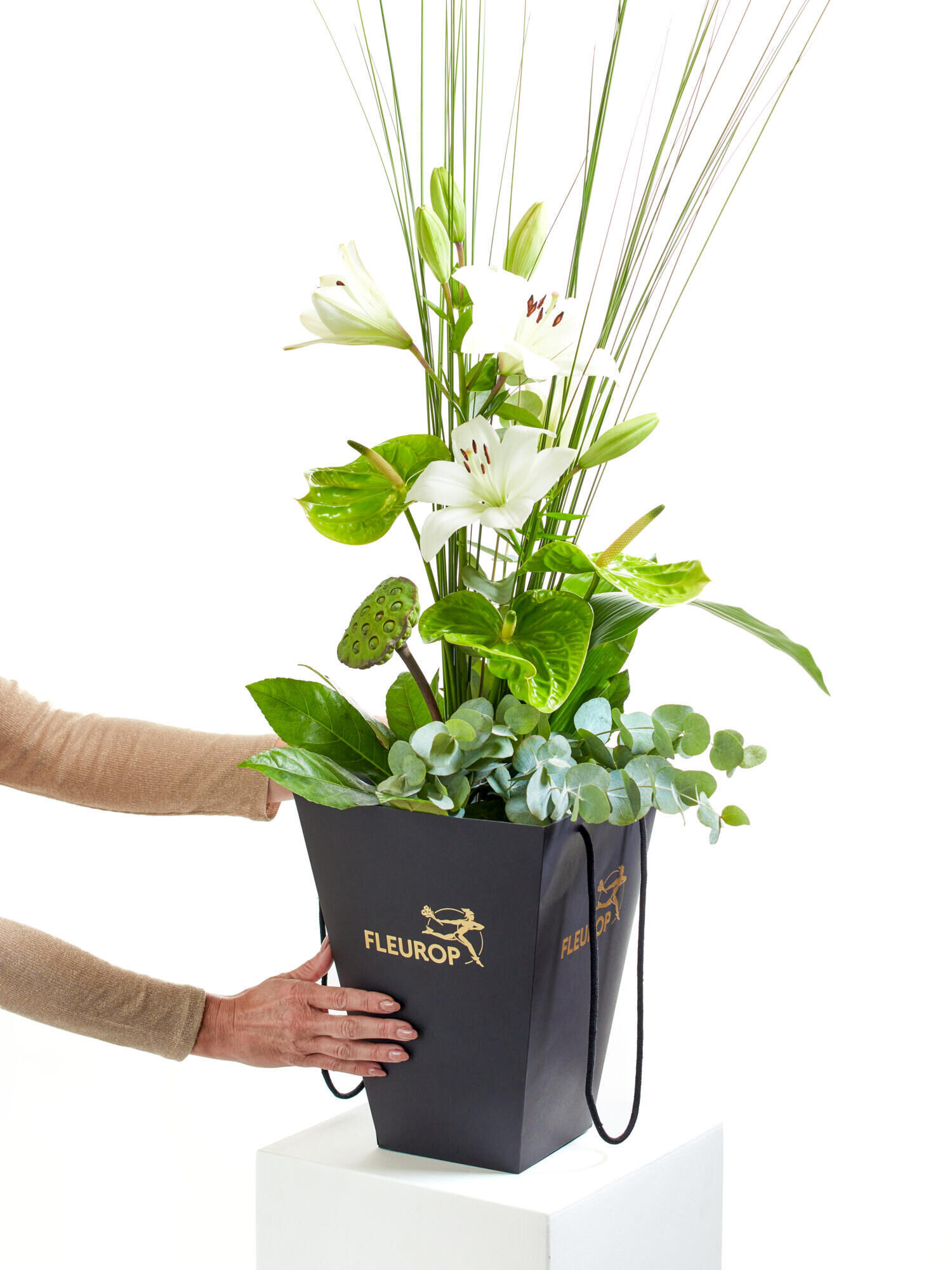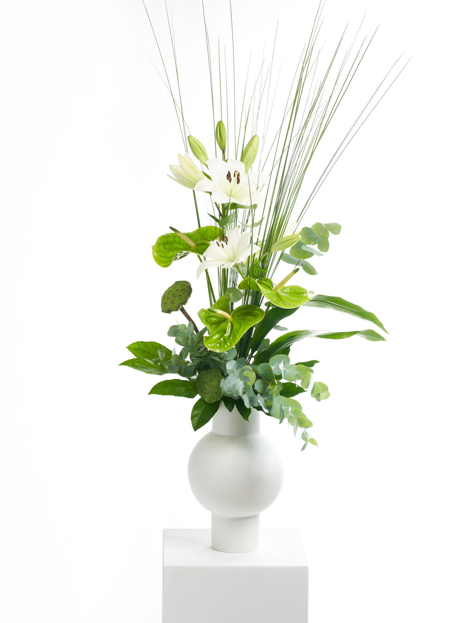 Gestaffelt gebundener Strauß in Weiß-Grün bestehend aus stark duftenden Lilien, Anthurien und Lotus. Als Beiwerk werden Aralie, Aspidistra, Eukalyptus und Steelgras verwendet. Bei geschlossenen Lilien kann das vollständige Aufblühen bis zu 5 Tage dauern.