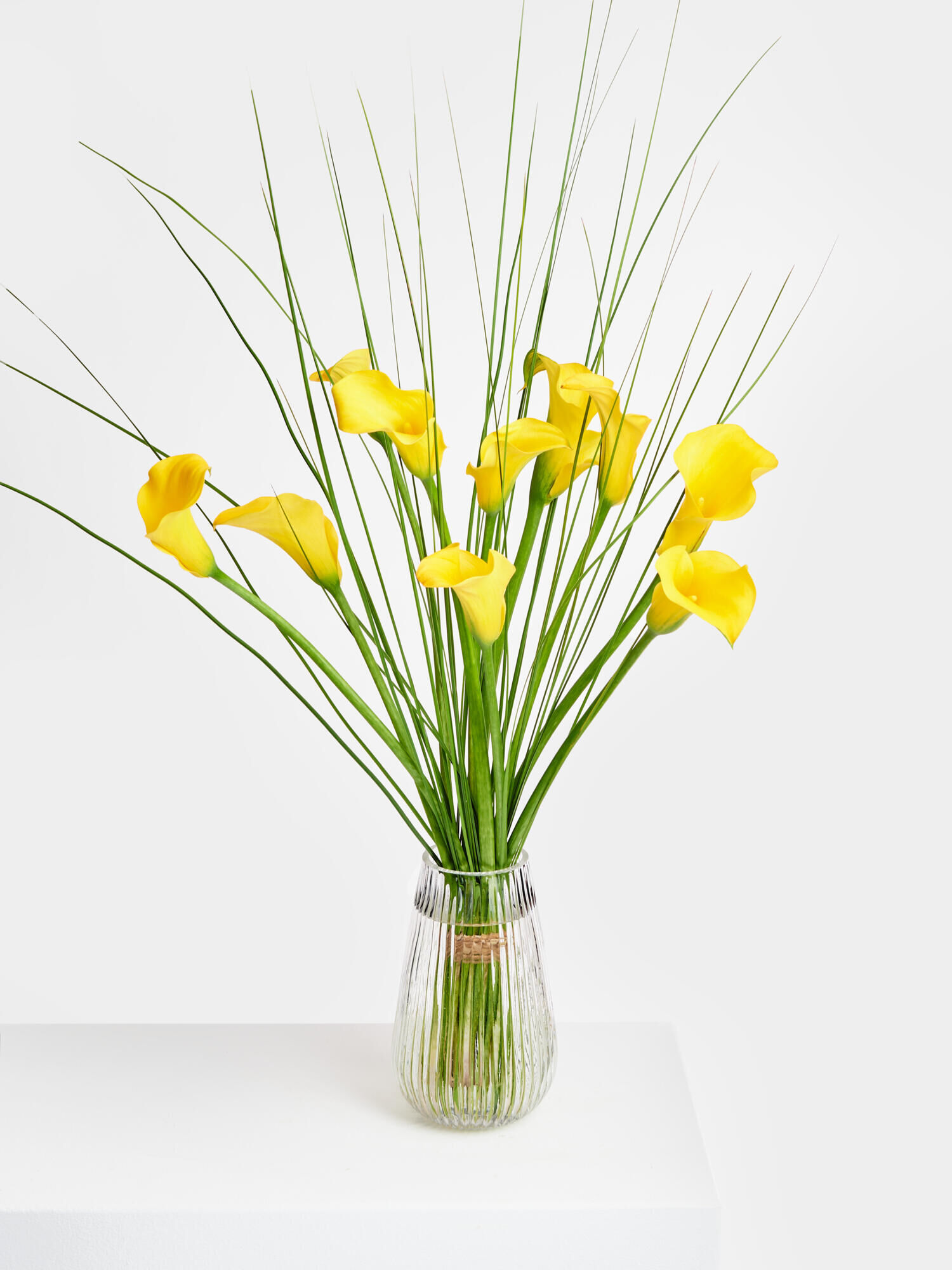 Entdecken Sie die zeitlose Eleganz unseres langstieligen Straußes aus leuchtend gelben Calla-Lilien und filigranen Steelgrass. Diese harmonische Kombination vereint Anmut und Stil, um Ihren besonderen Anlass zu einem unvergesslichen Erlebnis zu machen.