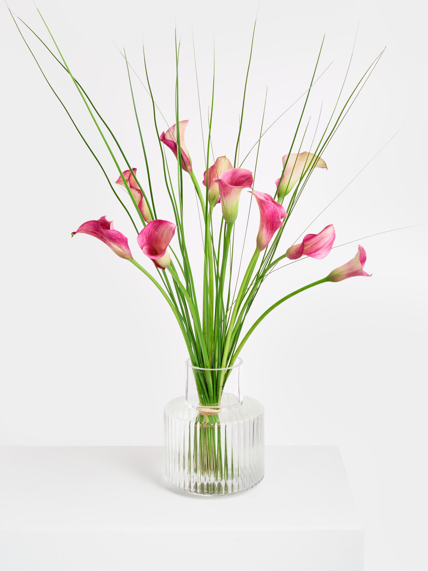 Verschenken Sie diesen stilvollen Blumengruß, und sorgen Sie für Glücksgefühle bei Ihren Liebsten. Lang gebundener Strauß aus auberginefarbenen Callas und filigranem Steelgras.