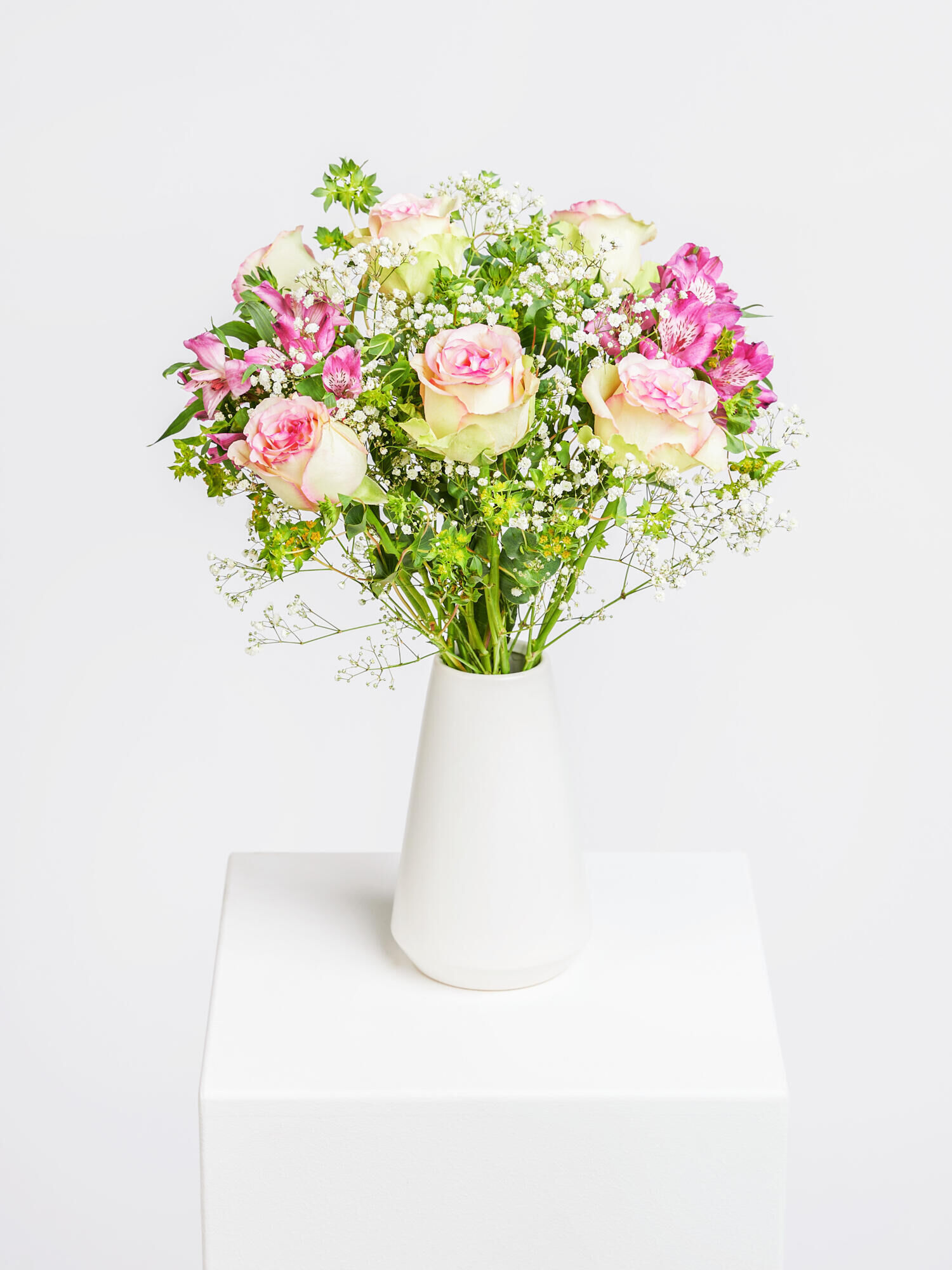 Ausgewählte Schnittblumen in Rosa-Pink mit Rosen und Alstromerien, die Sie in der eigenen Vase nach Belieben selbst arrangieren können. Als Beiwerk werden Schleierkraut und Bupleurum verwendet.