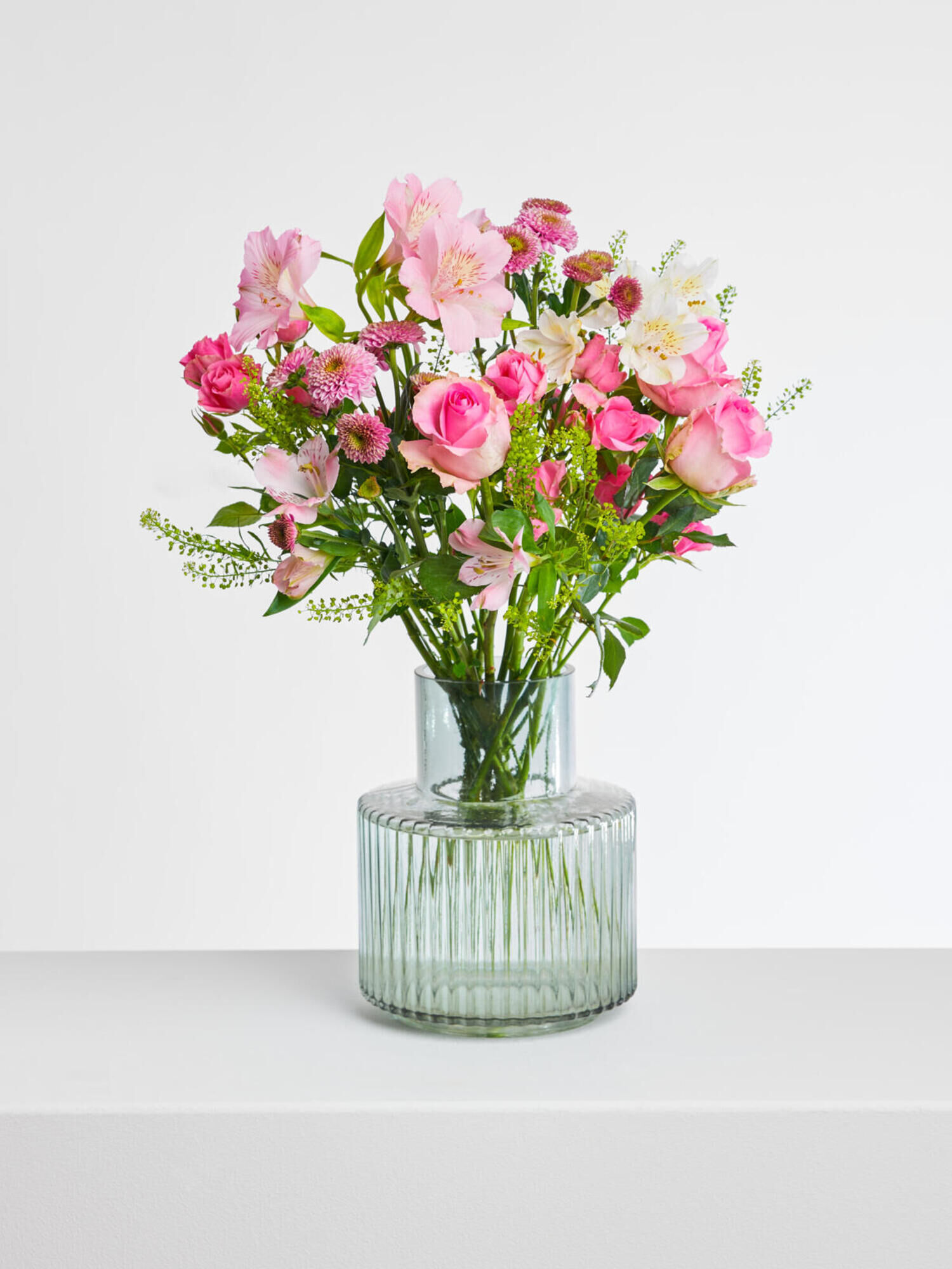 Ausgewählte Schnittblumen, bestehend aus pinken Fairtrade-Rosen, Santini, Lipidium und Alstromerien, die Sie in der eigenen Vase nach Belieben selbst arrangieren können. Stilecht verpackt im Fleurop-Karton.