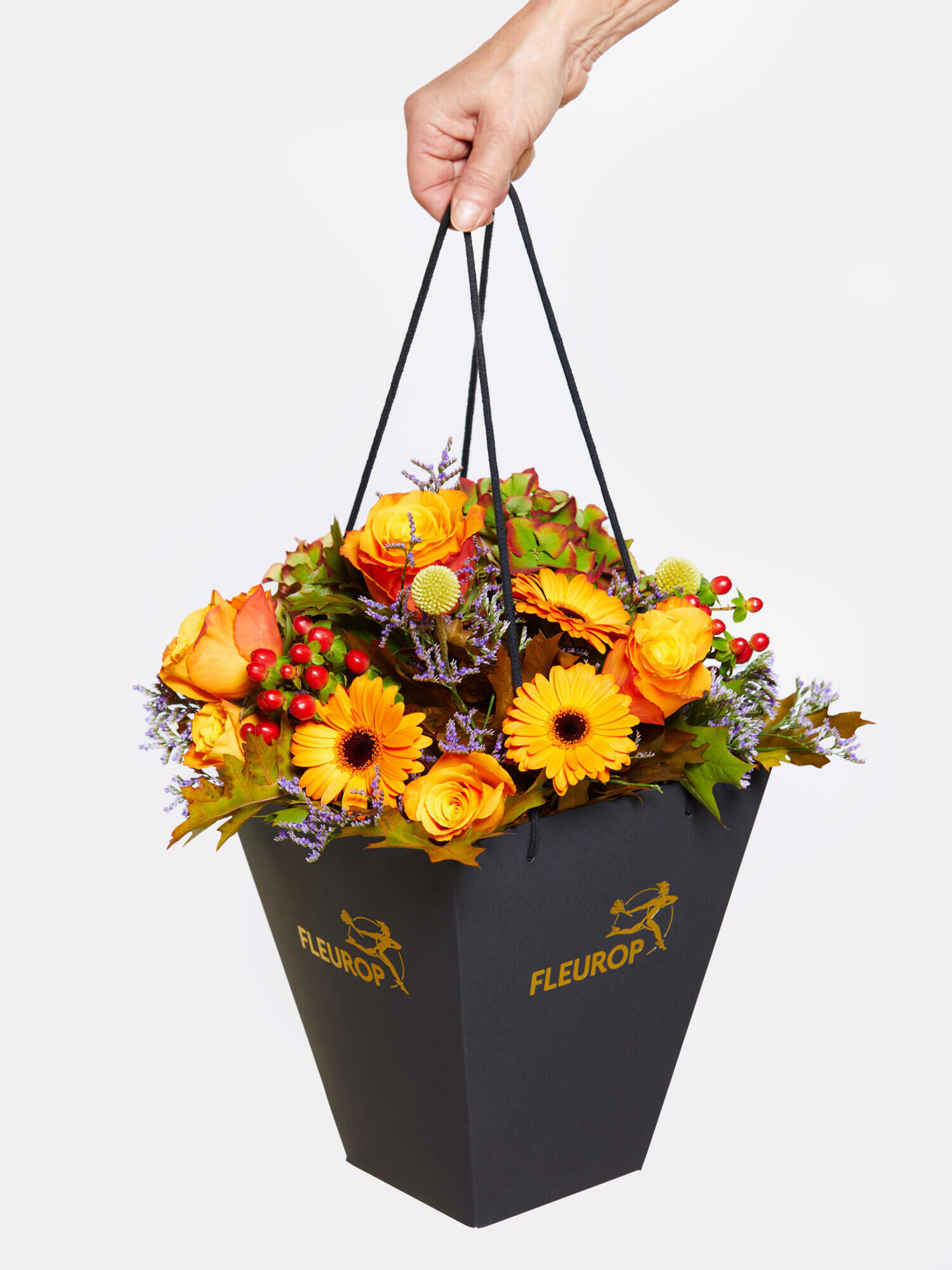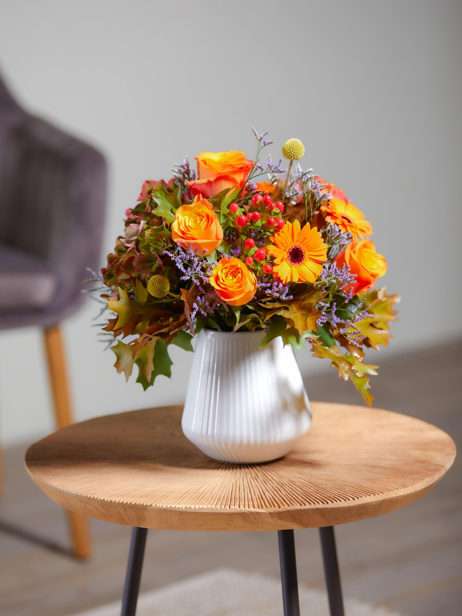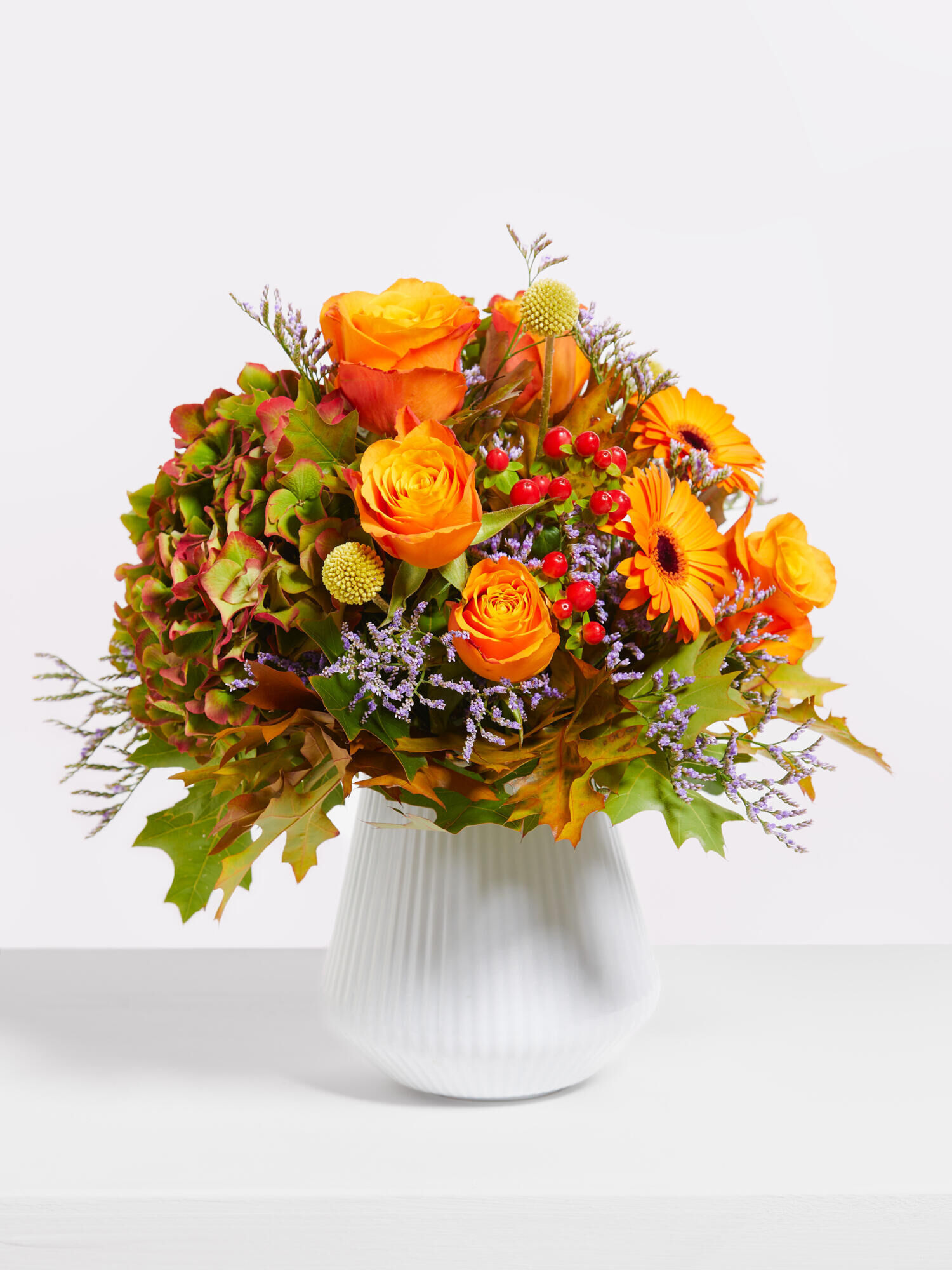 Kompakt gebundener Strauß in Orange-Rot-Gelb mit Rosen, Hortensien, Germini, Hypericum, Limonium und Craspedia. Als Beiwerk wird Eiche verarbeitet.