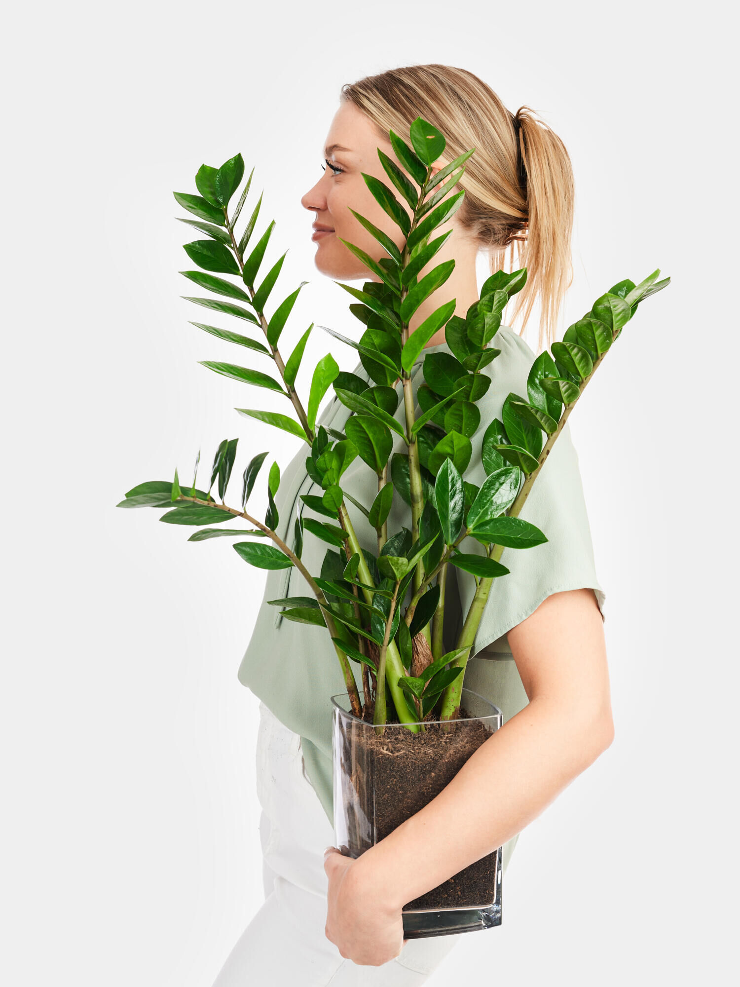 Verschenken Sie diese faszinierende Zimmerpflanze und bereiten Sie jemandem eine Freude. Die Glücksfeder, auch Zamioculcas genannt, wird in einer eleganten Fleurop-Vase mit Blumenerde geliefert.