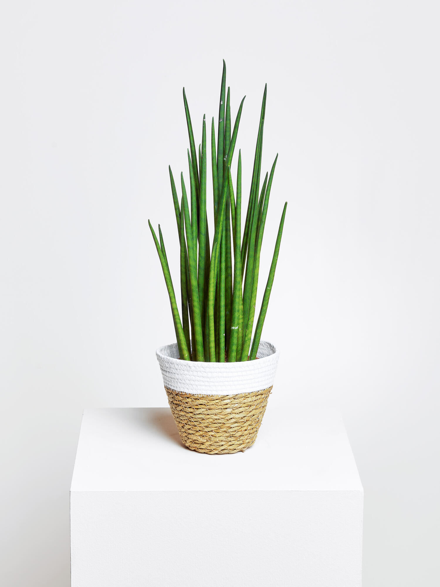Dekorative Zimmerpflanzen Sansevieria ‘Bacularis Mikado’ im zweifarbigen Seegrastopf (Ø 17 cm).