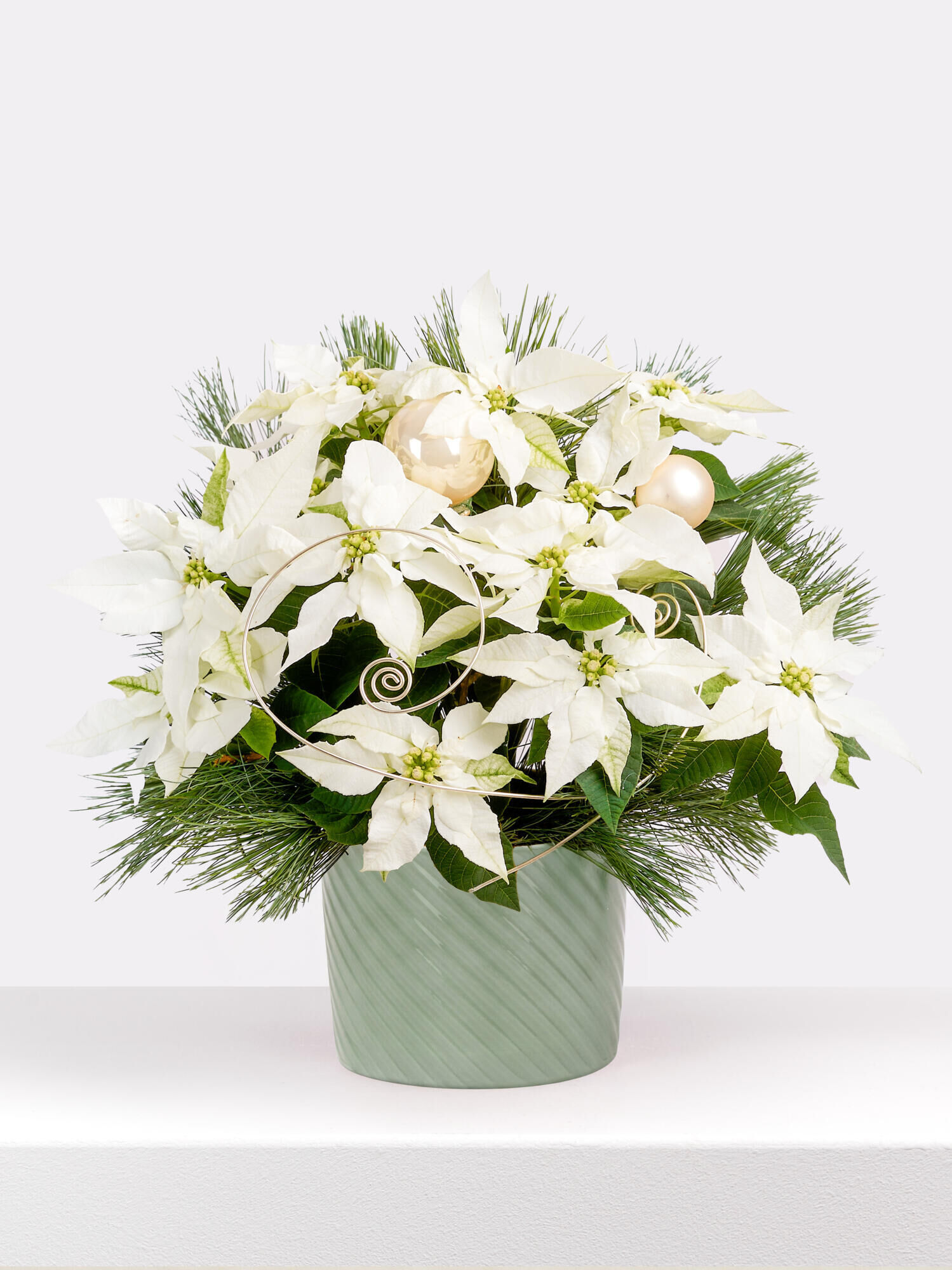 Cremefarbener Weihnachtsstern im Übertopf (salbeigrün, Ø 13,5 cm), geschmückt mit cremefarbenen Weihnachtskugeln aus Glas, Golddraht und Kiefernzweigen.