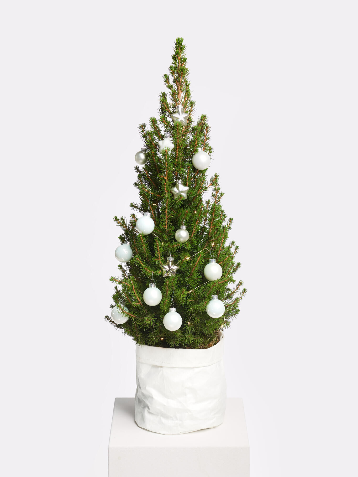 Überraschen Sie jemand Besonderes mit diesem bezaubernden Weihnachtsbaum: eine 60 cm hohe Zuckerhutfichte in einem eleganten weißen Papierübertopf. Die Fichte ist festlich geschmückt mit silbern und weiß schimmernden Glaskugeln und funkelnden Glassternen.