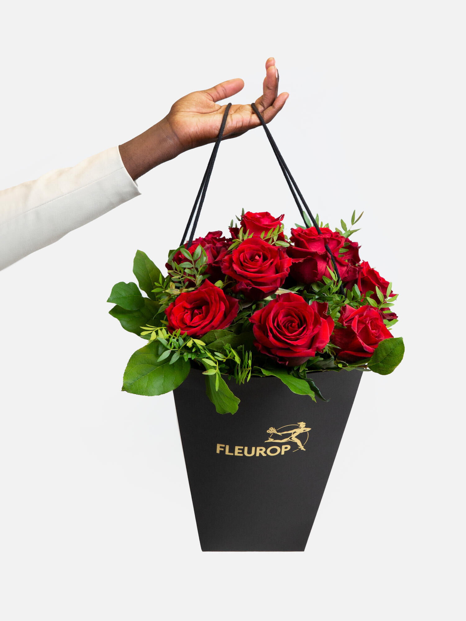 Rund gebundener Strauß mit roten Premium-Rosen. Pistazie und Salal werden als Beiwerk verwendet.