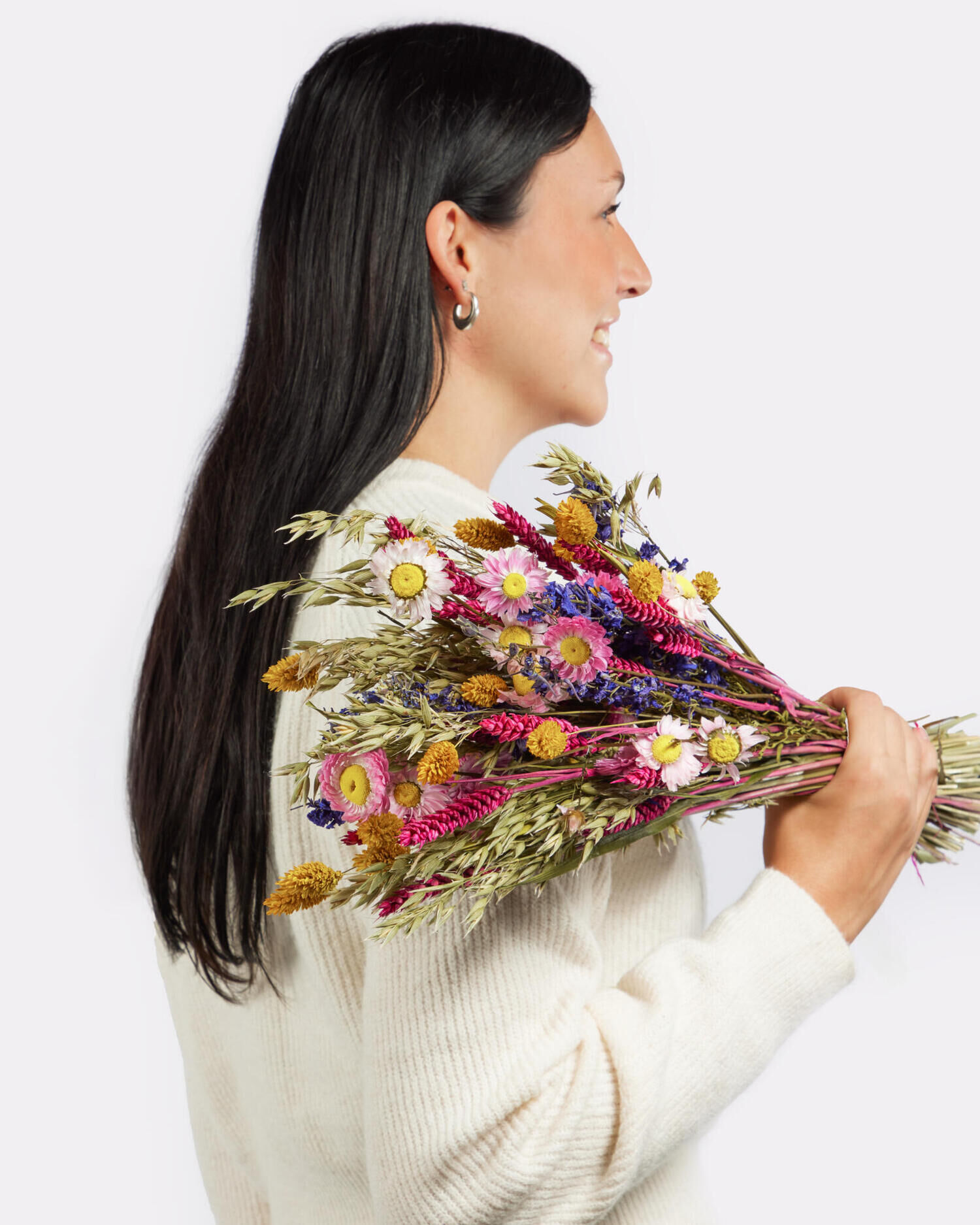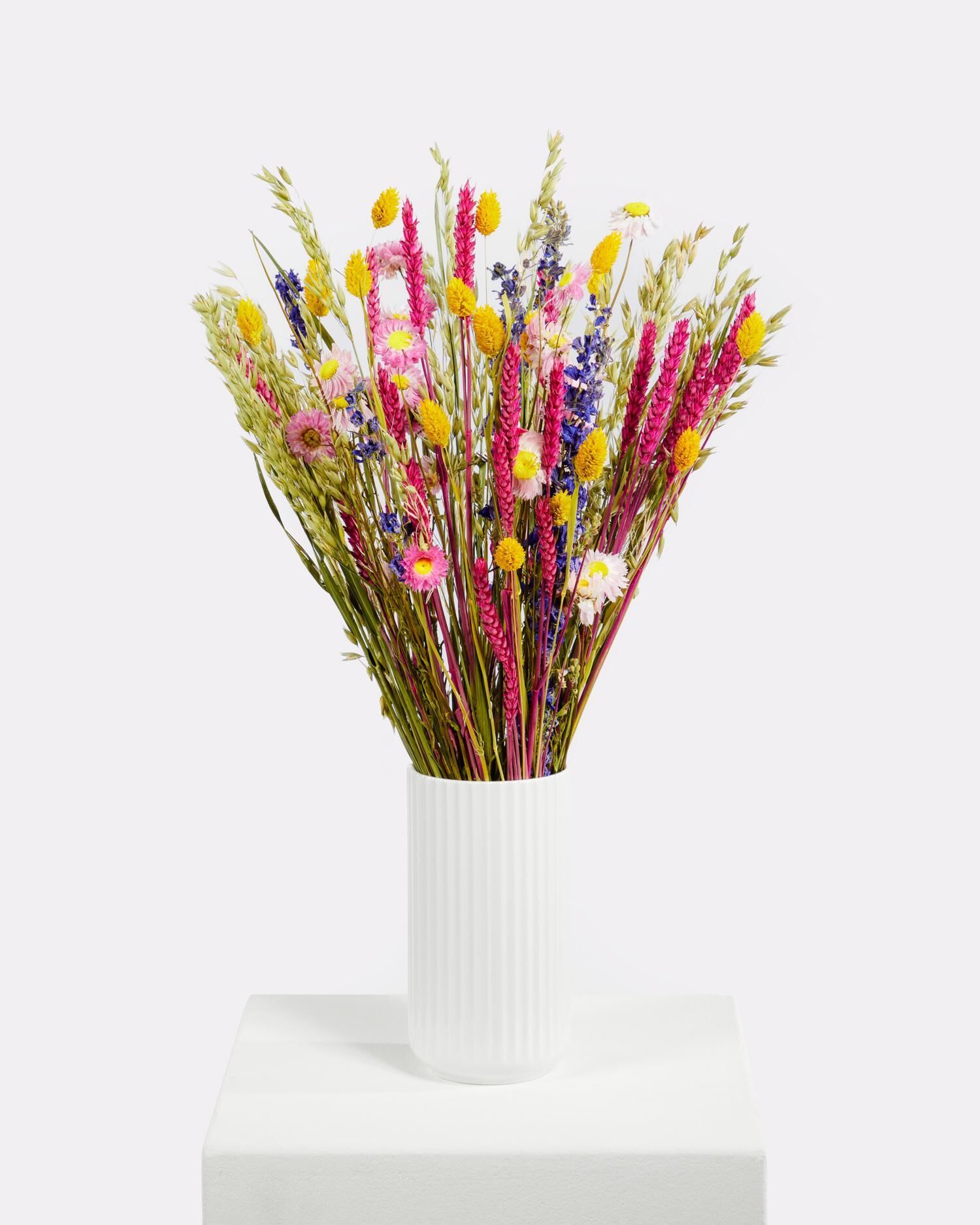 Dieser Trockenblumenstrauß ist nicht nur ein Blickfang, sondern auch besonders langlebig. Ohne Pflegeaufwand behält er über viele Monate hinweg seine natürliche Schönheit und verleiht jedem Raum eine lebendige und warme Atmosphäre. Ob als fröhlicher Akzent im Wohnzimmer, farbenfrohe Tischdekoration oder als Gute-Laune-Strauß im Homeoffice – der bunte Wildblumenstrauß bringt Farbe in den Alltag.