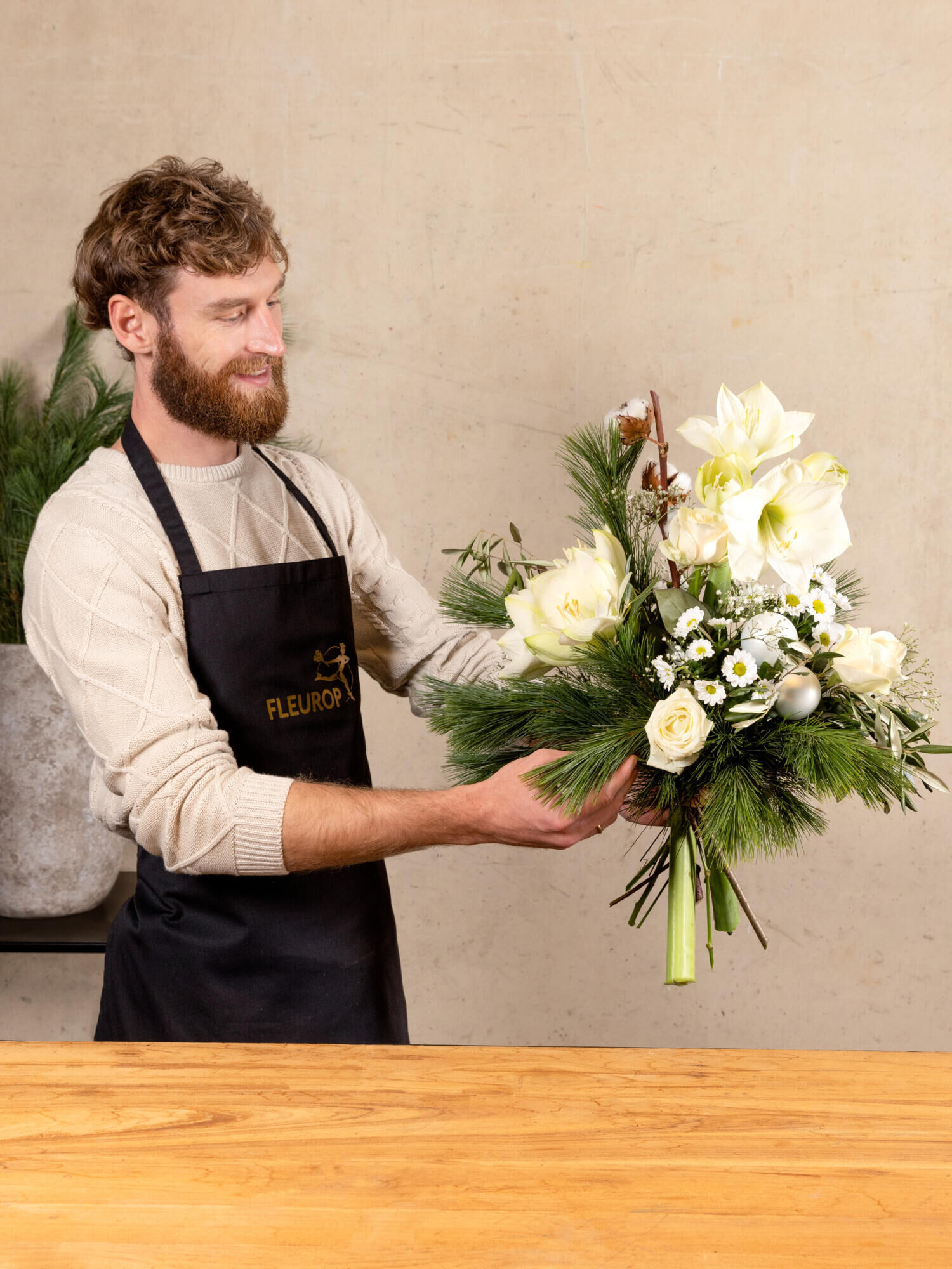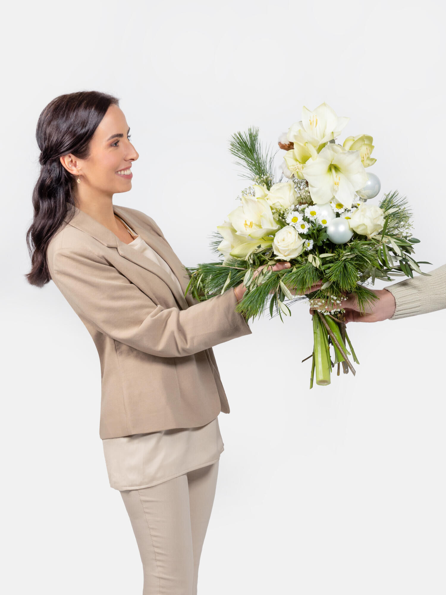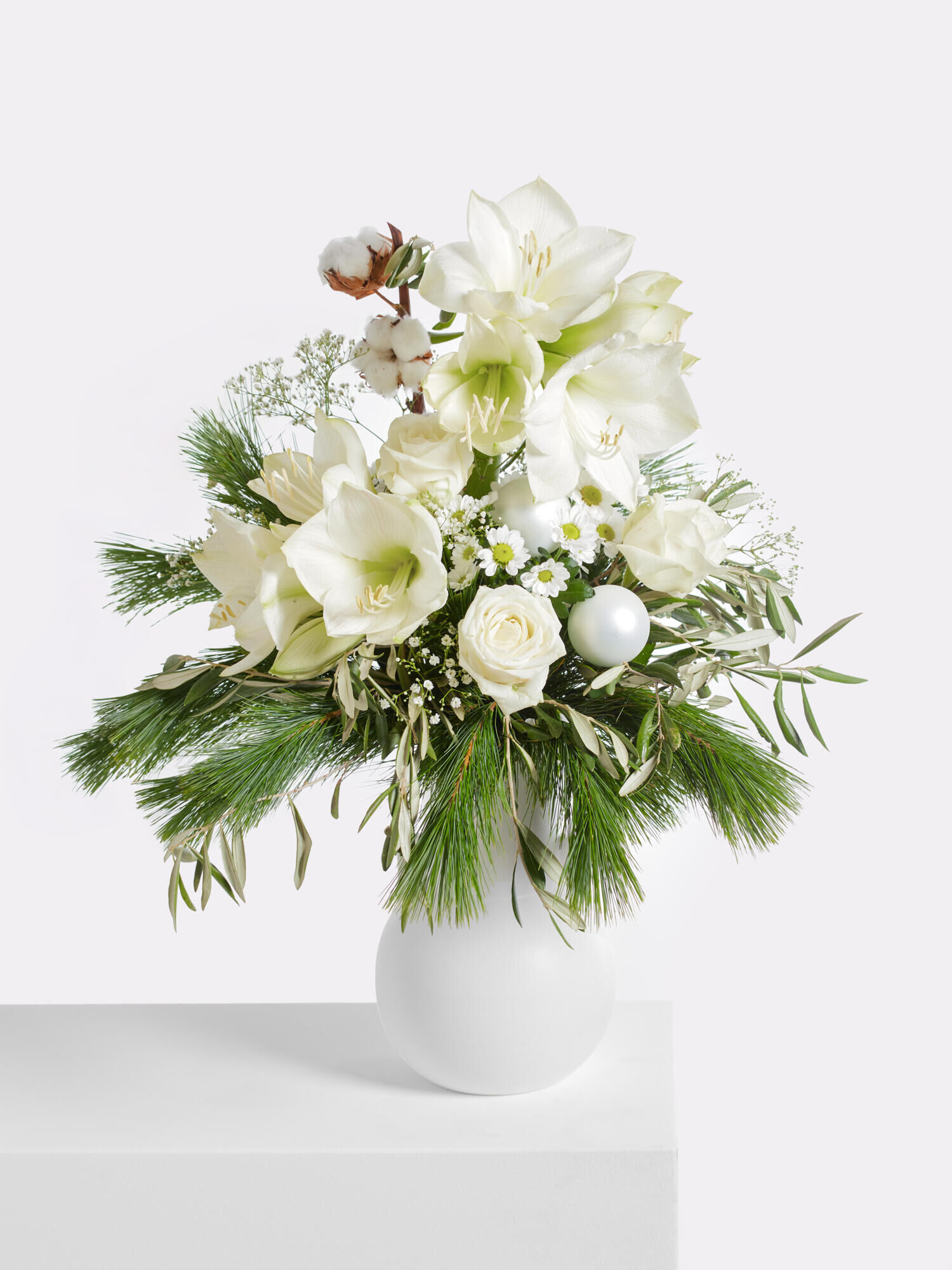 Rund gebundener Strauß in Weiß mit Amaryllis, Rosen, Santini und Schleierkraut sowie weißen Weihnachtskugeln aus Glas und Baumwolle als Accessoires. Als Beiwerk werden Kiefer und Olive verwendet. Bei geschlossenen Amaryllis kann das vollständige Aufblühen bis zu 2-4 Tagen dauern.