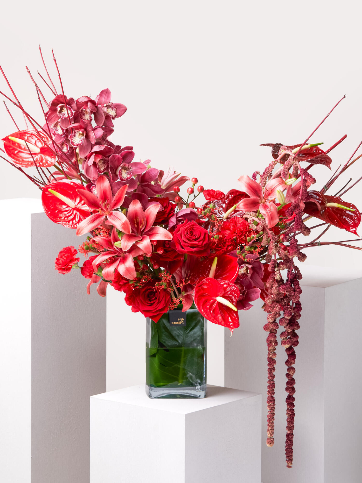 Intensiv duftendes Gesteck aus Lilien, Rosen, Nelken, Anthurien, Orchideen-Blüten, Amaranthus und Monstera-Blätter