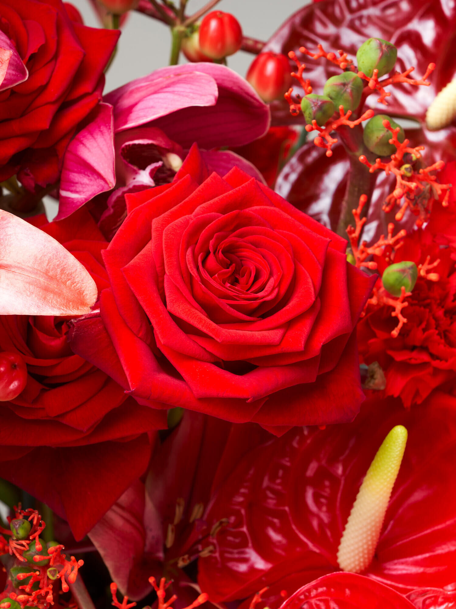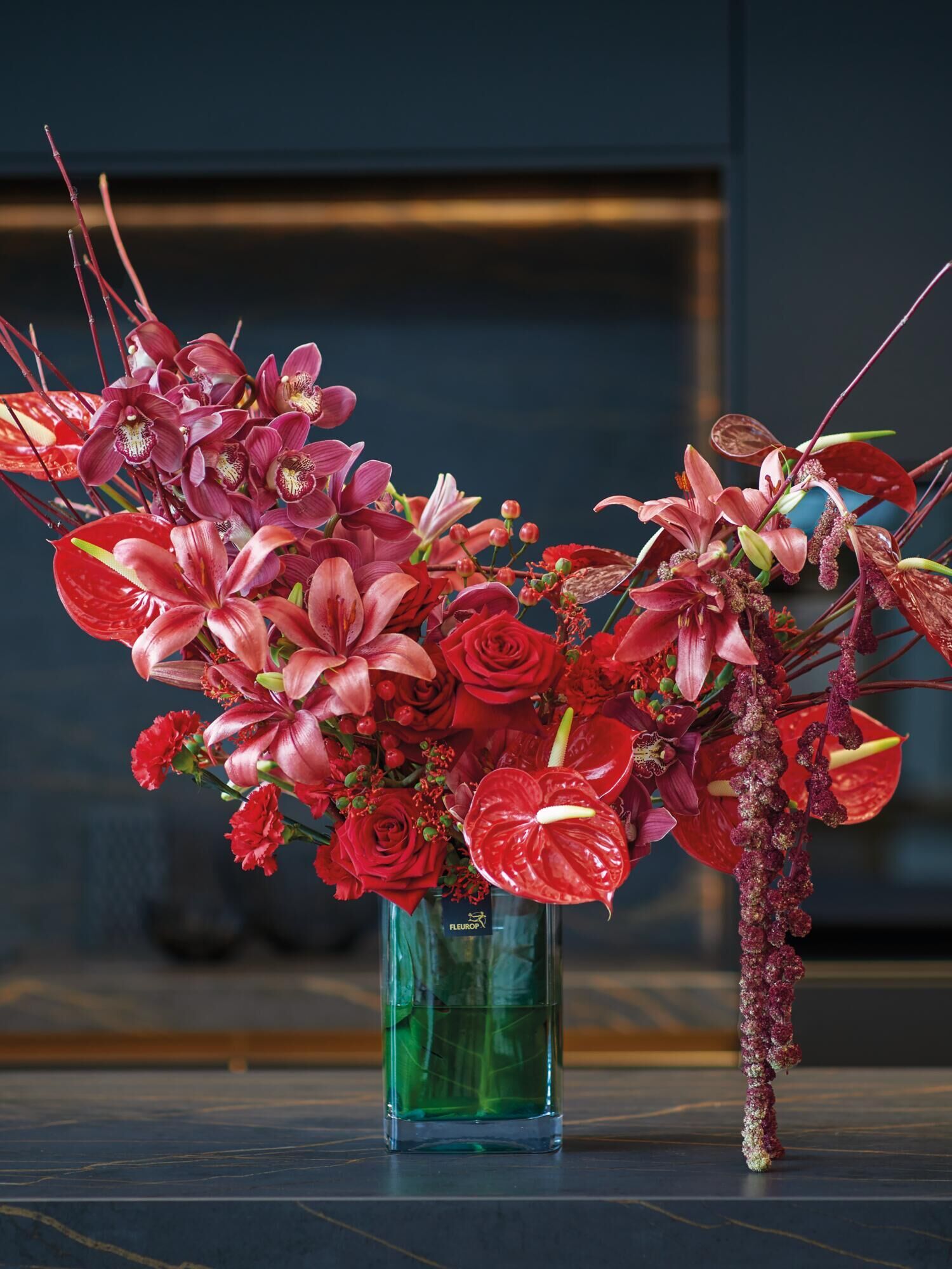 Das Herzstück bildet eine halbmondförmig angeordnete Komposition aus sorgfältig ausgewählten Cornus-Zweigen, die als formgebende Elemente dienen und den Blick sanft über das tiefrote Blütenmeer wandern lassen. Eingebettet in diese Struktur findet die Cymbidium-Blüte ihren Ruhepol – asymmetrisch gesteckt, um einen visuellen Schwerpunkt zu setzen, der das Auge fesselt und gleichzeitig Raum für Entdeckungen lässt.
