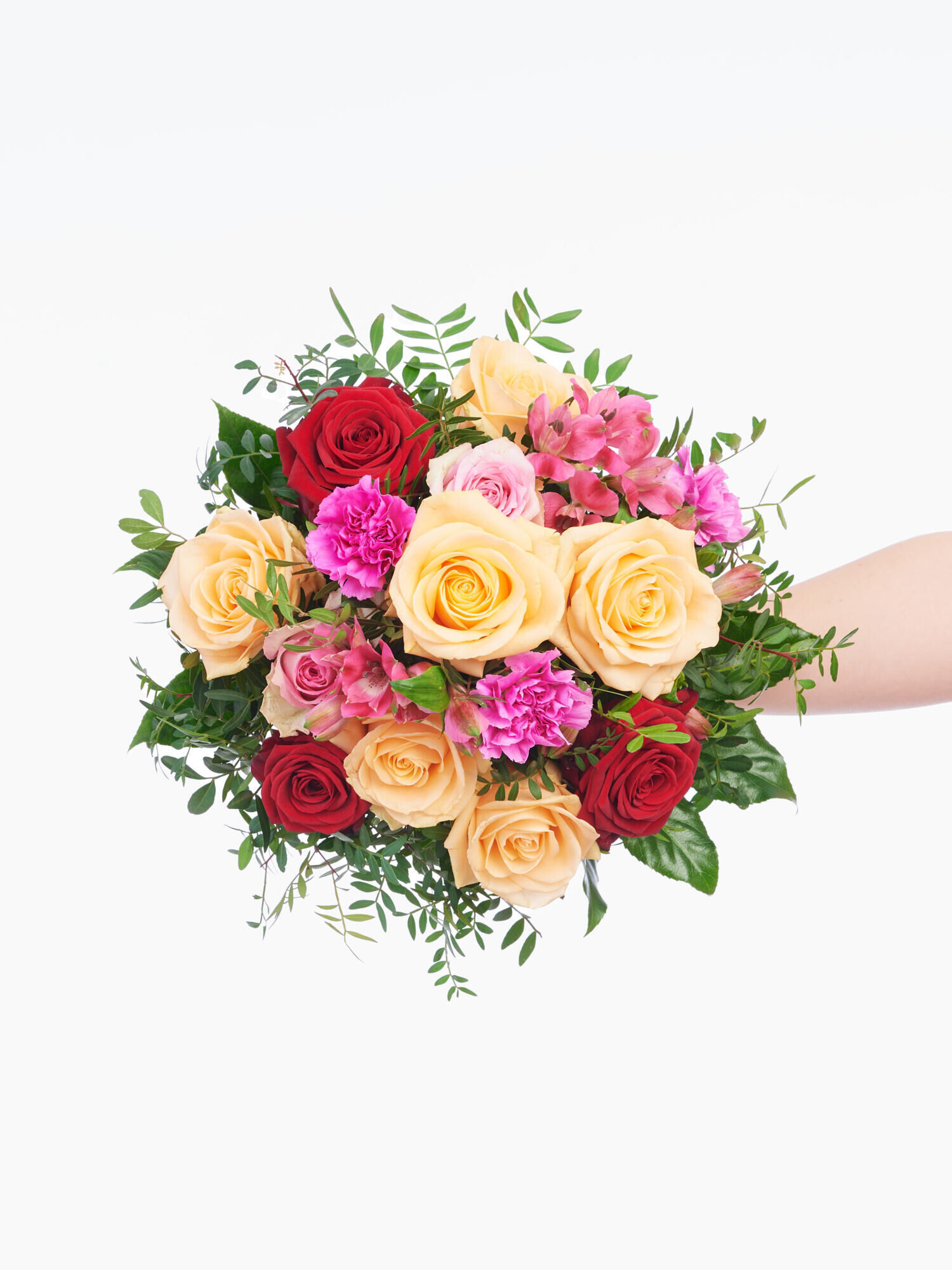 Rund gebundener Strauß in Apricot-Pink-Rosa-Rot mit Rosen, Nelken und Alstromerien. Als Beiwerk werden Pistazie und Aralie verwendet.