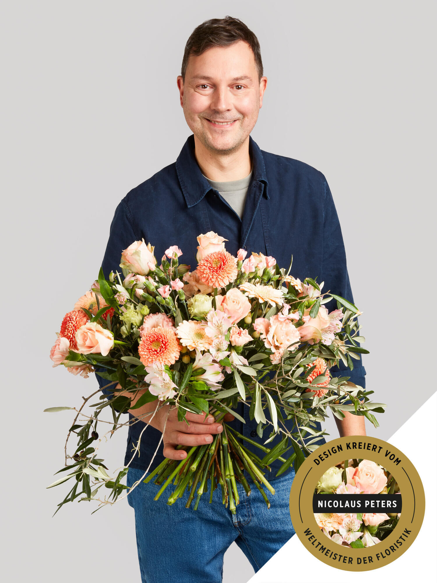 Mit „Peachy Romance“ verschenken Sie ein Floristik-Meisterwerk der Harmonie. Dieser Strauß, kreiert vom Weltmeister Nikolaus Peters, erinnert mit seinen zarten Apricot- und Creme-Töne der Rosen, Germini, Nelken, Inkalilien, Hypericum und Eustoma an einen romantischen Sonnenuntergang und wird durch das frische Grün der Olive perfekt ergänzt. Ein Geschenk, das von Herzen kommt und lange Freude bereitet.
