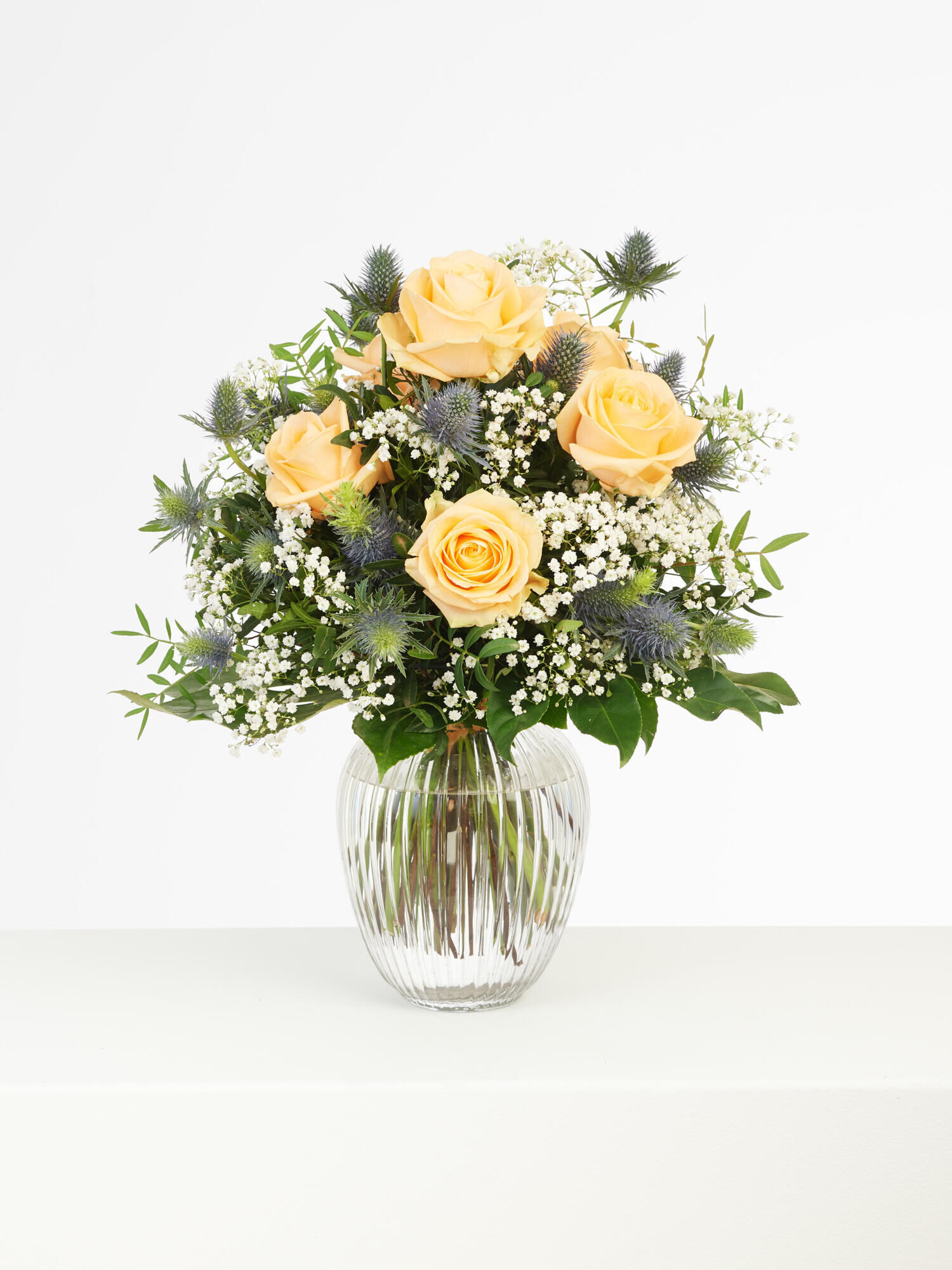 Rund gebundener Strauß in Apricot-Blau-Weiß mit Rosen, Schleierkraut und Disteln. Als Beiwerk werden Pistazie und Aralie verwendet.